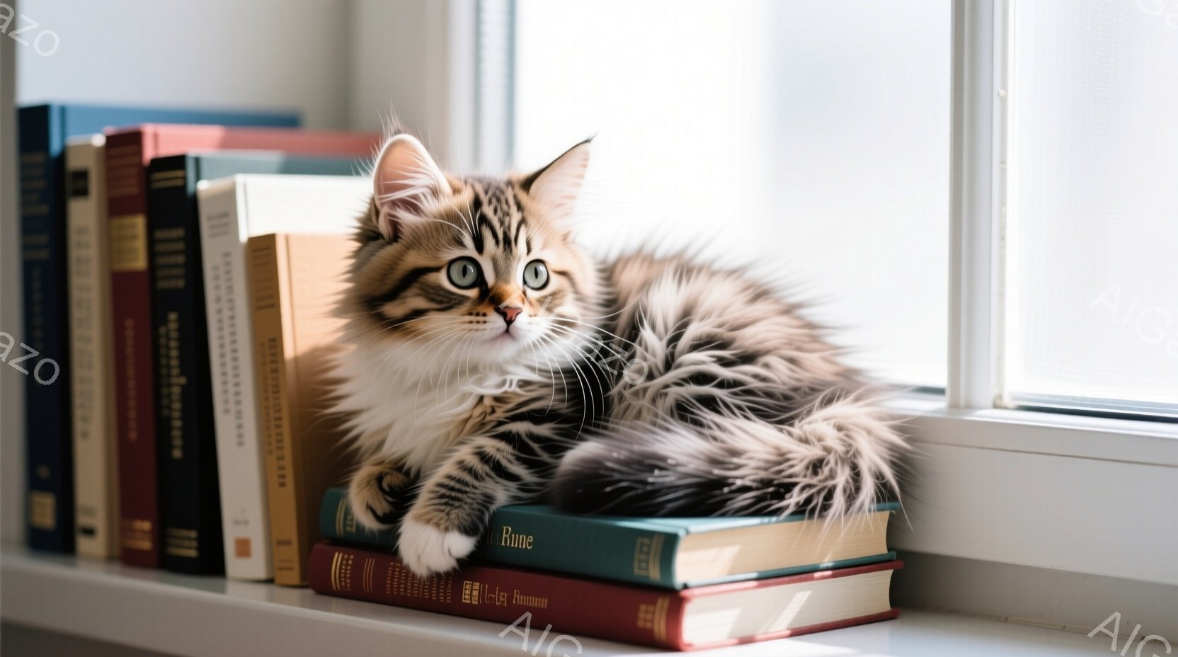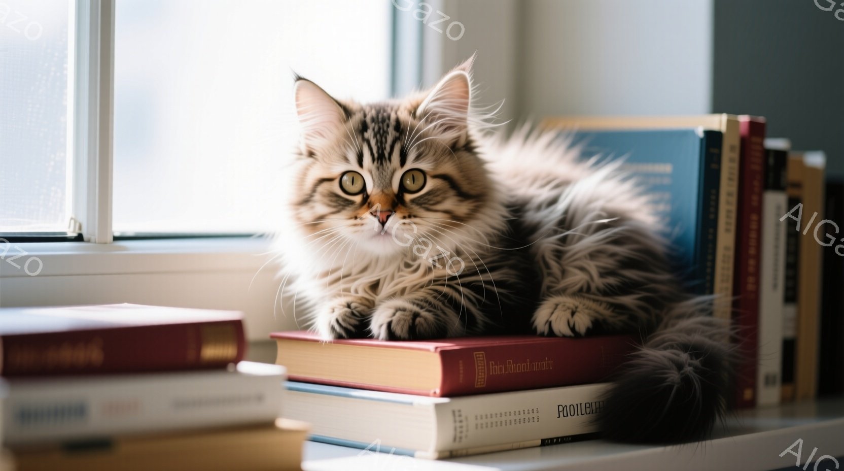 長い毛並みの茶トラ猫が、積み重ねられた本の上に丸まって座っています。窓辺に置かれた本棚の一部で、猫はリラックスした表情でこちらを見ており、日の光が柔らかく照らされています。全体的に、落ち着いた暖かさを感じさせる静謐な雰囲気です。