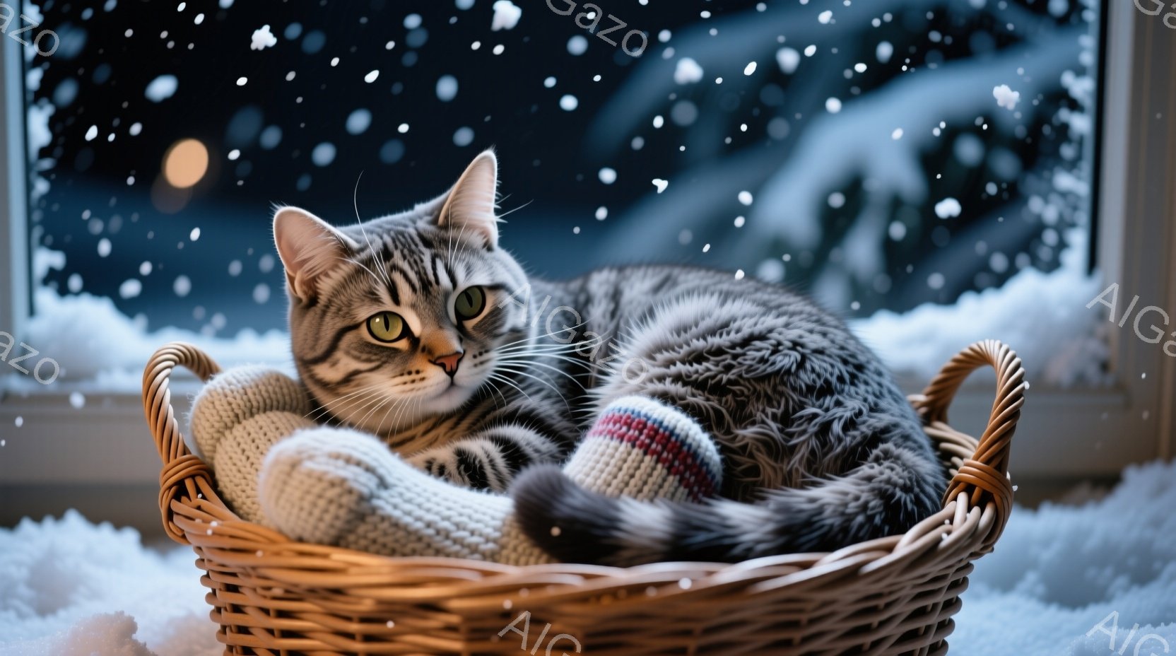 縞模様の猫が、編み物の敷物が入った籐のバスケットの中に横たわっている。猫はリラックスした表情で、少しこちらを見ている。背景には雪が降る冬景色がぼんやりと見え、全体的に暖かく穏やかな雰囲気が漂っている。