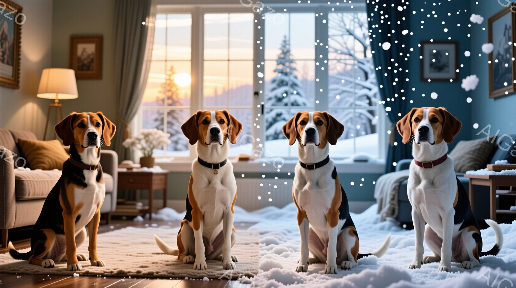 ゴールデンレトリバーの子犬が、カラフルなラグの上に仰向けに寝そべっています。窓の外には雪景色が広がり、夕焼けの光が室内を暖かく照らしています。温かく穏やかな雰囲気が漂う、冬の日の居間の光景です。