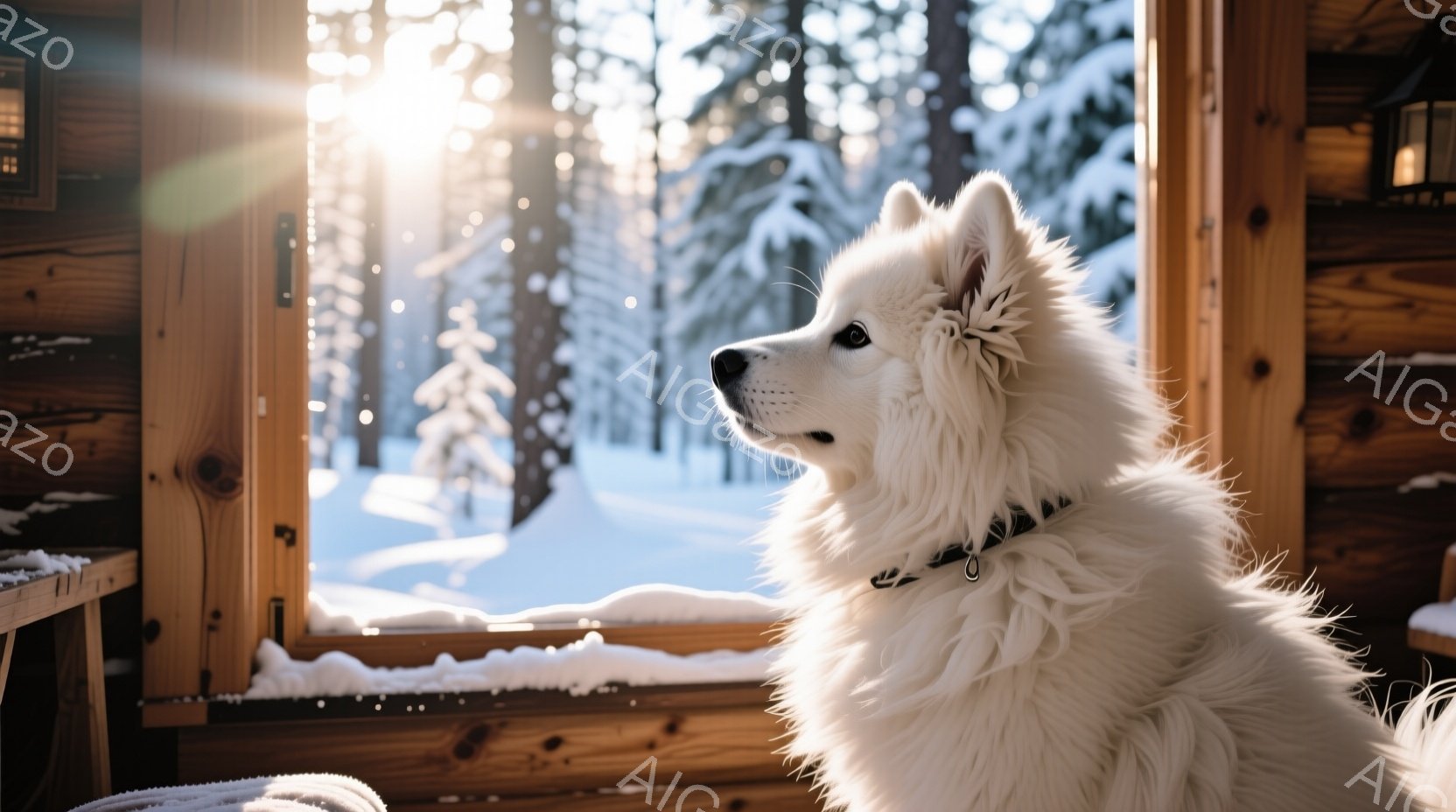 白い毛並みの犬が、窓の外の雪景色を眺めています。窓枠には雪が積もり、背景には雪に覆われた木々が広がる冬の風景が広がっています。暖かく落ち着いた雰囲気で、犬は静かに外の景色を楽しみながら、リラックスした時間を過ごしているようです。