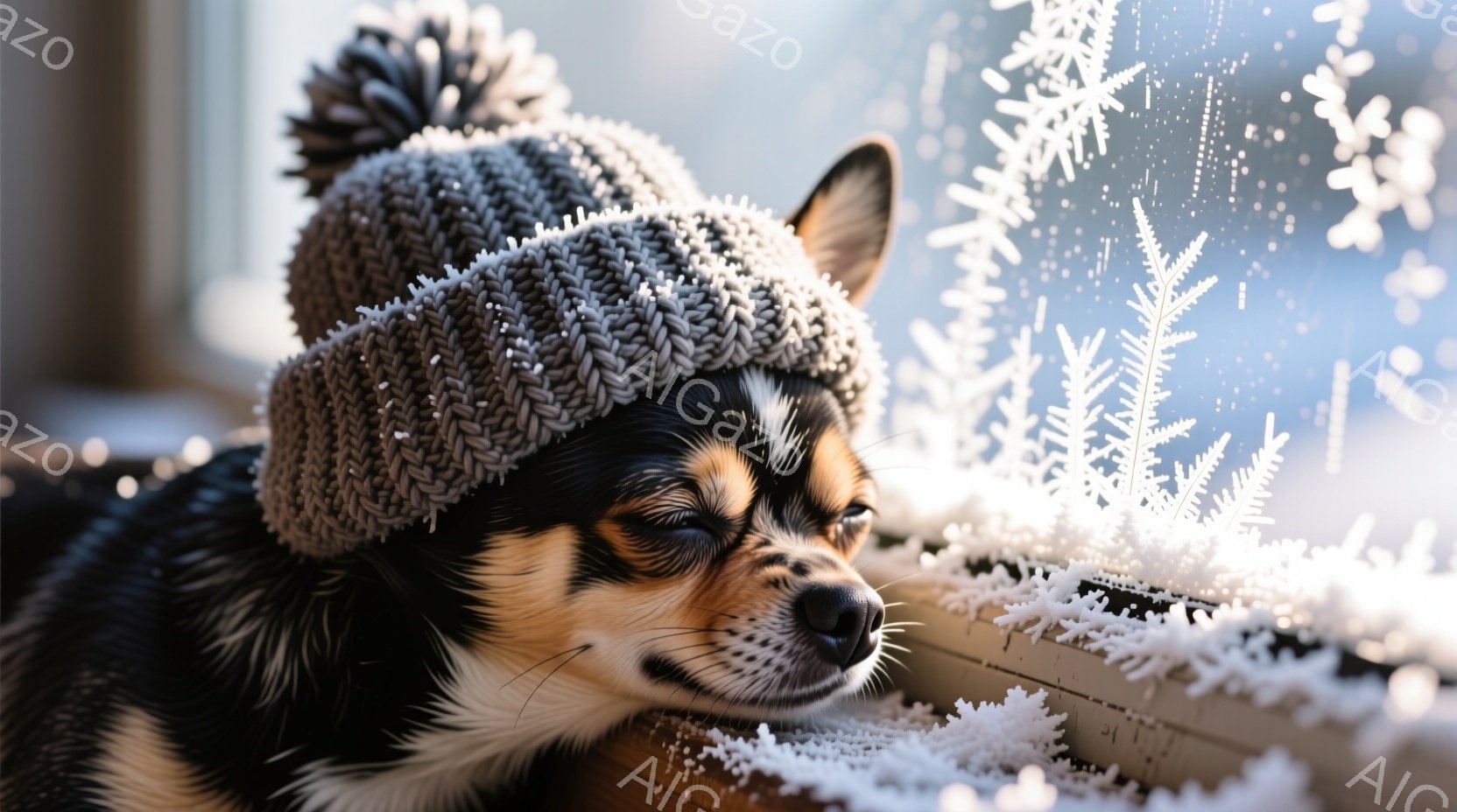 茶色の毛並みと黒い斑点模様のチワワが、冬らしいニット帽をかぶって窓辺でうつむいて眠っています。窓ガラスには雪の結晶が描かれており、室内からの暖かさと、外の寒さが対照的な様子が伺えます。全体的に穏やかで、冬の日の暖かな午後の雰囲気が漂っています。