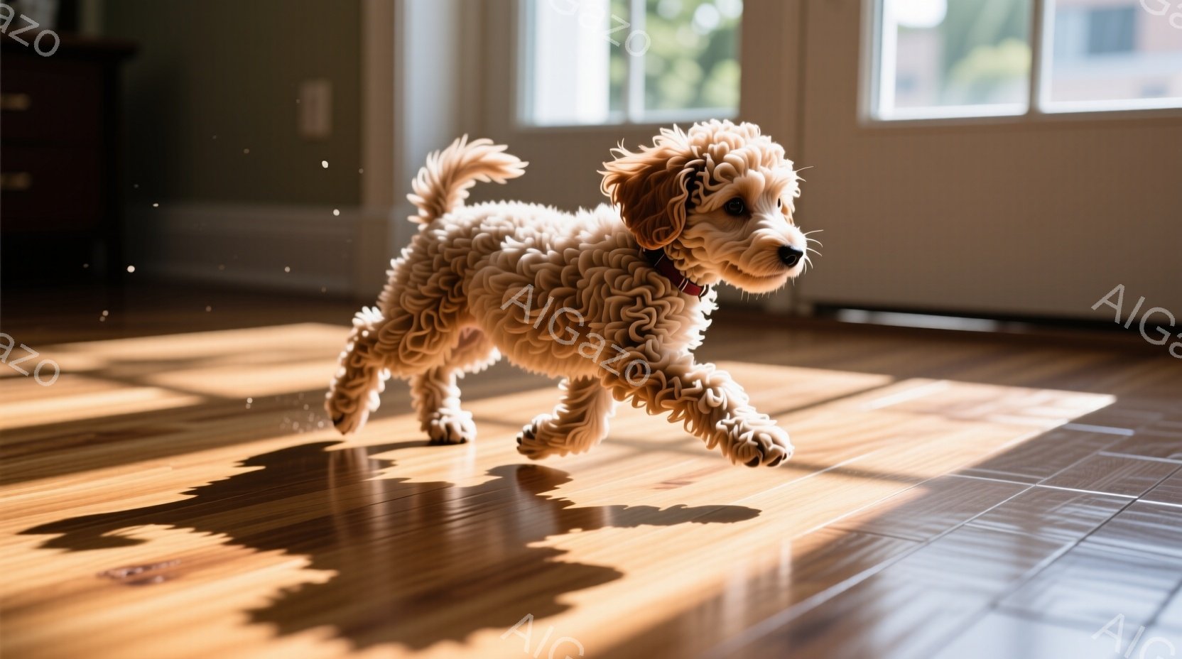 明るい日差しの差し込むフローリングの上を、ふわふわのクリーム色の巻き毛の犬が元気に走り回っている。犬は首輪をつけており、楽しげな表情で前方を向いている。背景には大きな窓と薄いカーテンが見え、室内は温かく穏やかな雰囲気が漂っている。
