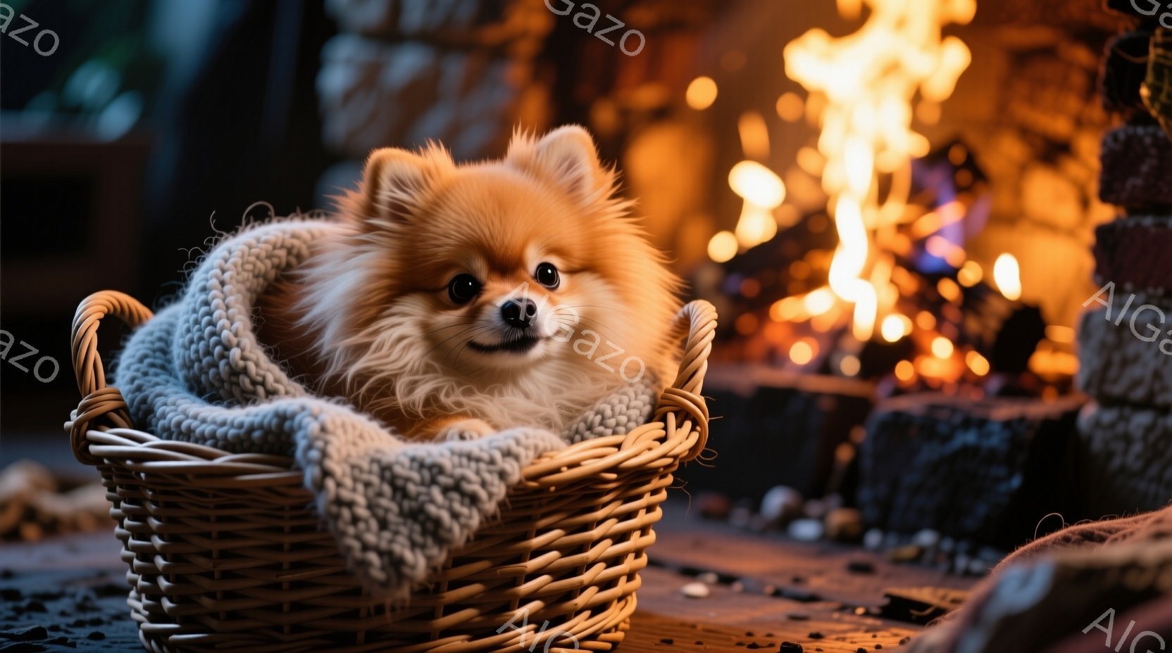 ふわふわのクリーム色のポメラニアンが、編み物のブランケットが敷かれた籐の籠の中に丸まって座っています。その表情は少し控えめで、好奇心と安心感が混ざったような穏やかな印象を与えます。背景には暖炉の炎が燃え盛り、暖かく心地よい雰囲気を醸し出しています。