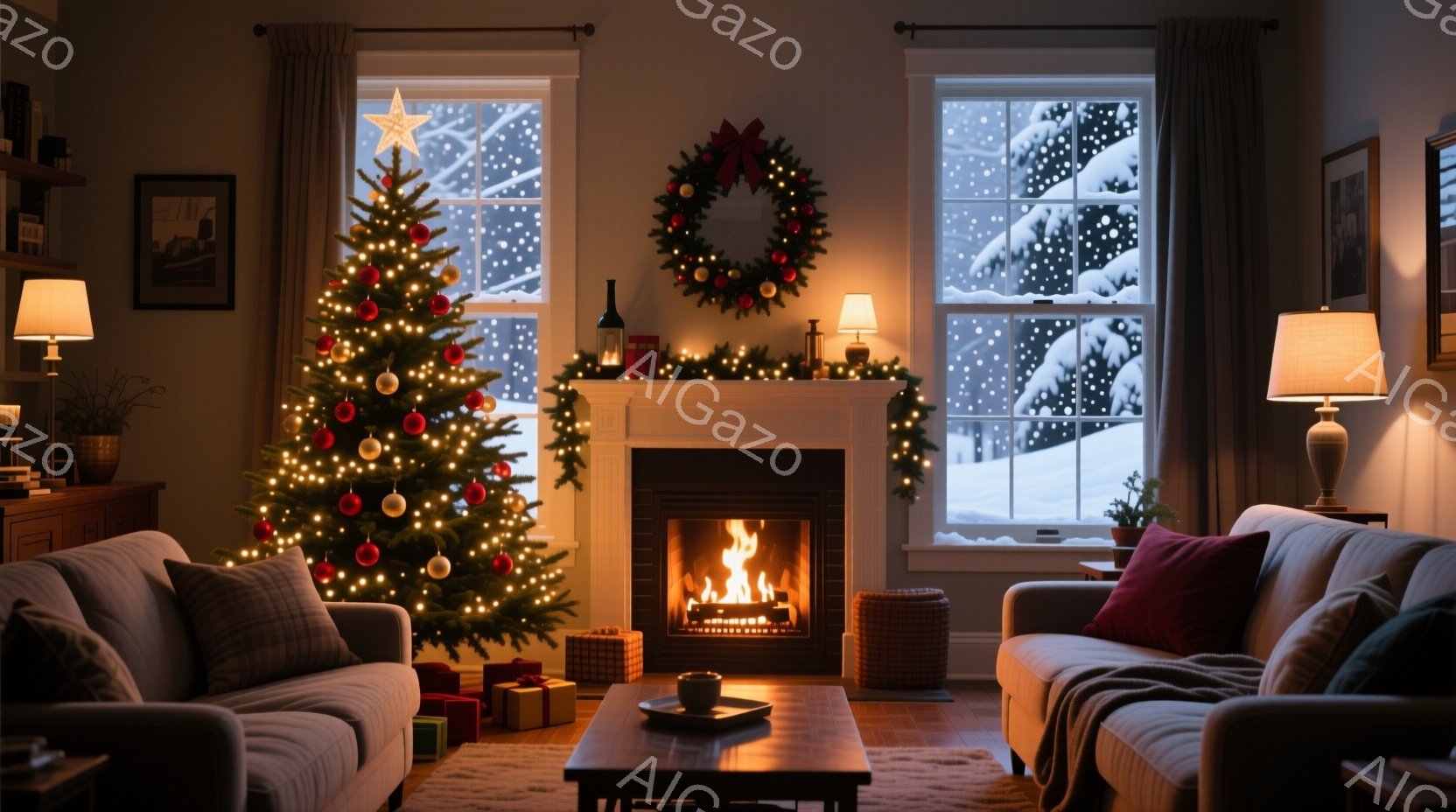 暖炉の火が灯る居間には、クリスマスツリーが飾られ、プレゼントの箱が並べられています。窓の外は雪景色で、温かく穏やかなクリスマスの雰囲気が漂っています。壁には絵画が飾られ、部屋全体が柔らかい光に包まれています。