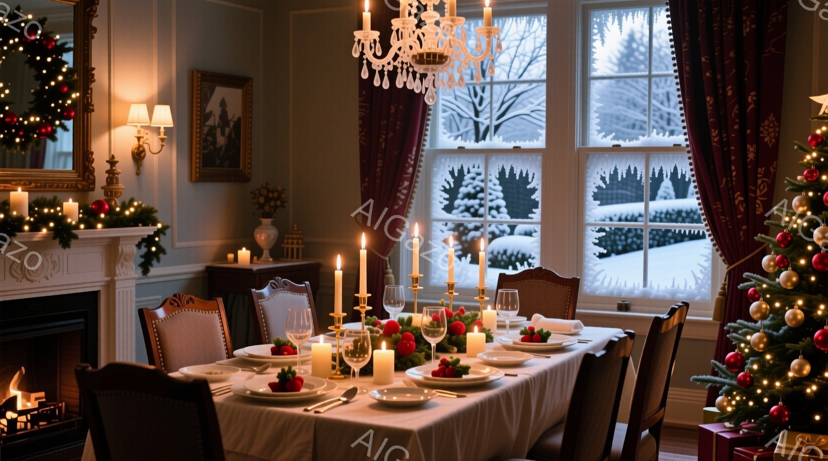 暖炉のある豪華なダイニングルームで、窓の外は雪景色が広がっています。テーブルは白いクロスで覆われ、キャンドル、食器、そして赤い飾りで美しくセッティングされており、クリスマスまたは特別な機会のための準備ができている様子が伺えます。部屋全体は温かく、落ち着いた雰囲気で、冬の静寂と祝祭の喜びが感じられます。