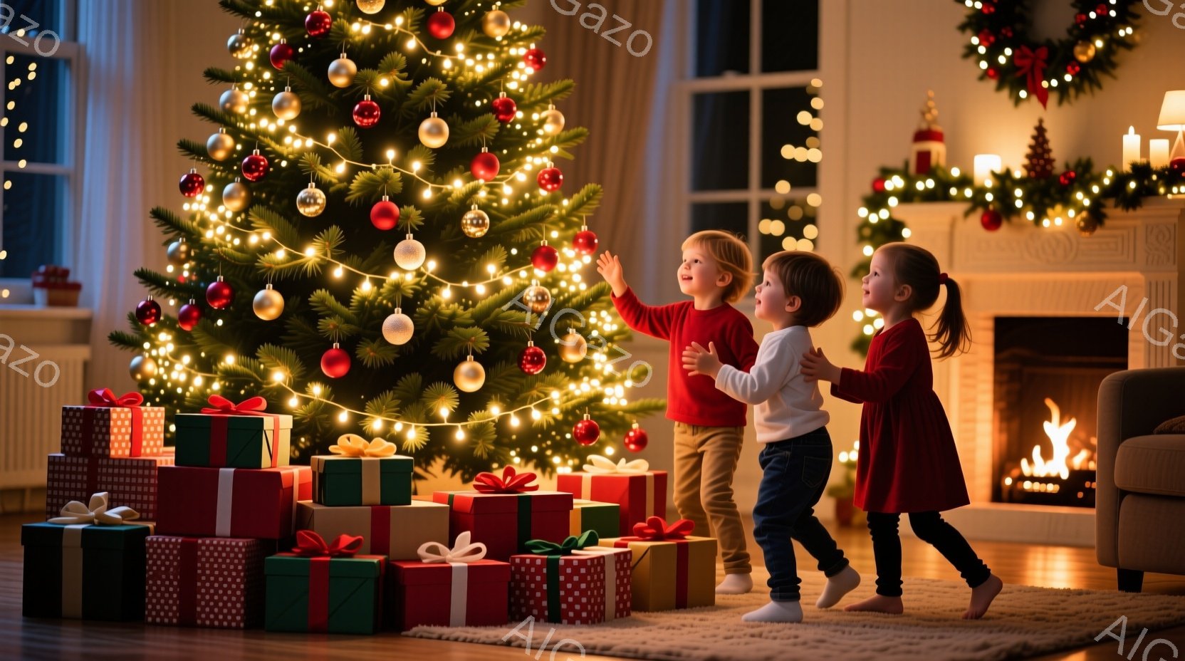 クリスマスツリーの周りにプレゼントの山があり、赤いドレスを着た女の子と赤いセーターを着た男の子が楽しそうに遊んでいます。ツリーは様々な色のオーナメントと電飾で飾られ、暖炉からは温かい光が差し込み、家族の温かい雰囲気が伝わってきます。背景にはキャンドルが灯り、クリスマスの温かく幸せな雰囲気が漂っています。
