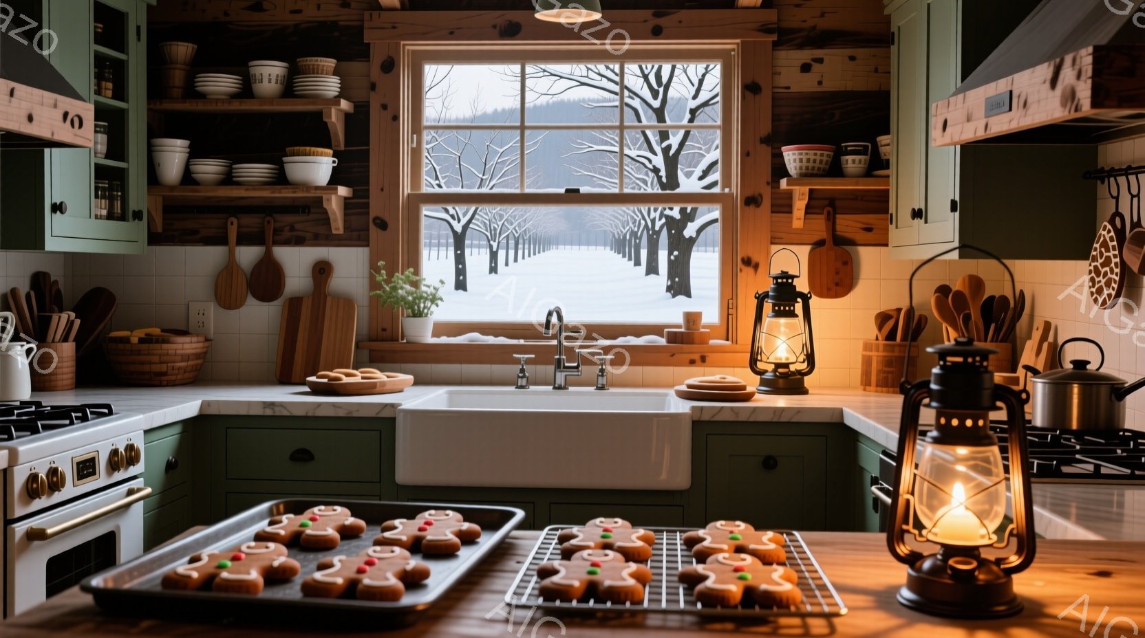 暖炉のある素朴なキッチンで、窓の外には雪景色が広がっています。カウンターにはジンジャーブレッドクッキーが並べられ、ランプや食器が温かみのある雰囲気を醸し出しています。全体的に落ち着いた色調と雪景色が、冬の静けさと家庭的な温もりを感じさせる空間を作り出しています。
