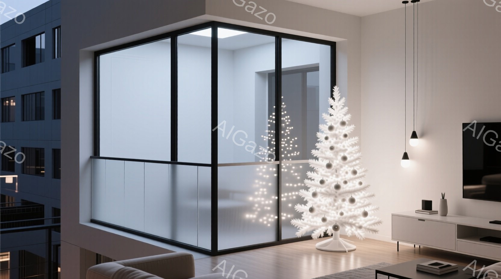 現代的なリビングルームのバルコニーに白いクリスマスツリーが設置されており、都市の夜景が背景に見えます。室内は白を基調としたミニマルなデザインで、暖色系の照明が落ち着いた雰囲気を演出しています。バルコニーのガラス越しには、ライトアップされた建物群が広がり、都会的で洗練された印象を与えます。