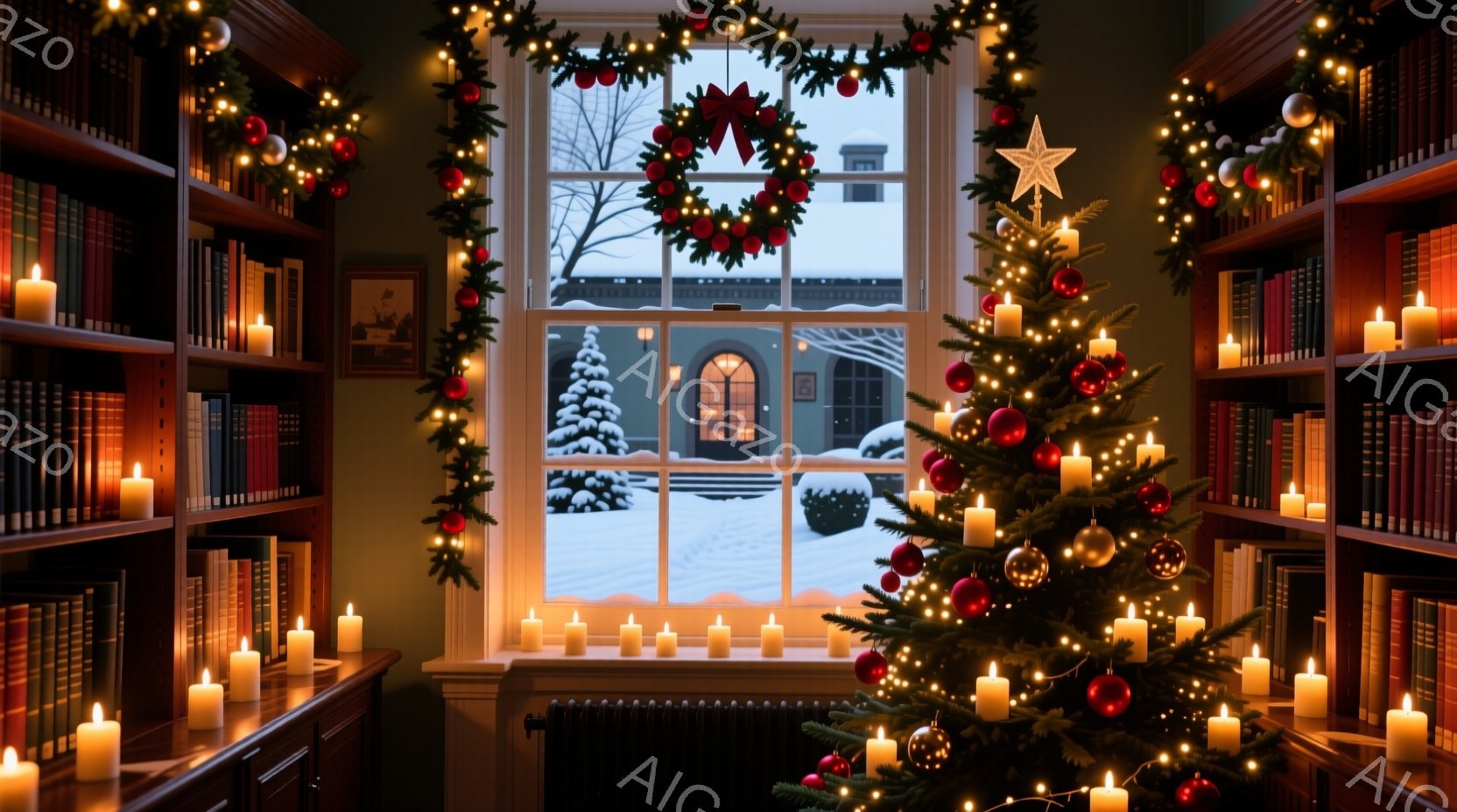 暖炉のある木造コテージの室内が描かれています。窓の外は雪景色で、氷の結晶が窓枠に付着しており、冬の寒さを感じさせます。ロッキングチェアやバスケット、クリスマスソックスなど、温かみのある装飾が施され、静かで落ち着いた雰囲気が漂っています。