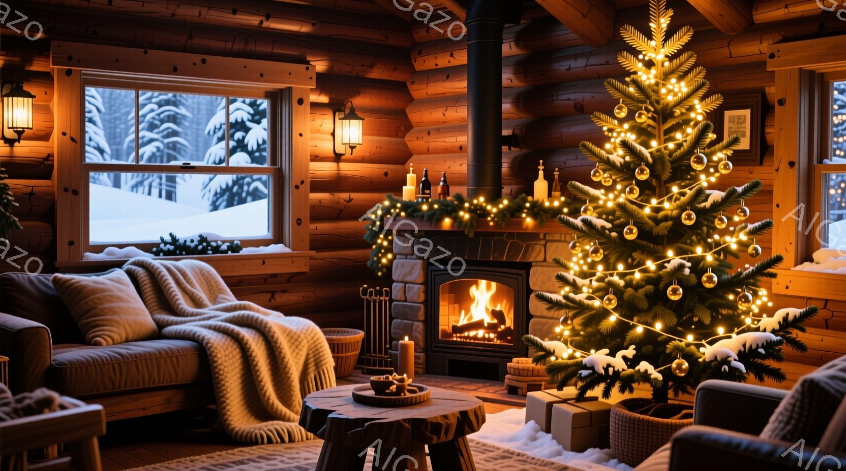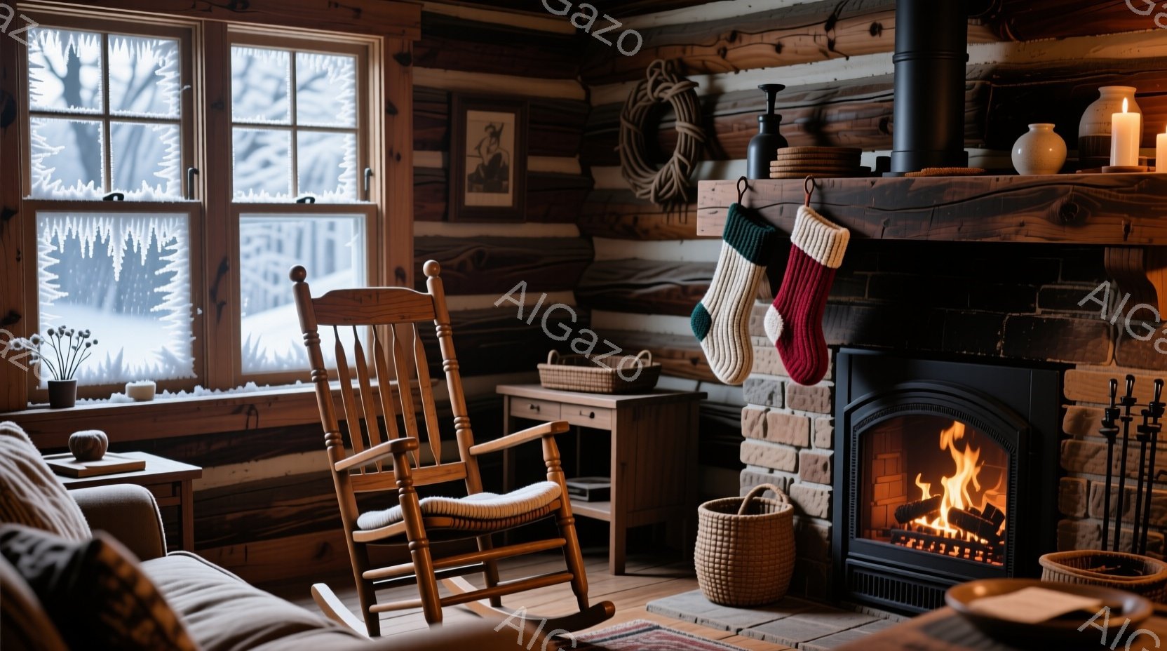 暖炉のある木造コテージの室内で、窓の外は雪景色が広がっています。ロッキングチェアと小さなテーブル、そしてソックスが暖炉の上に飾られ、温かく居心地の良い雰囲気を醸し出しています。壁は木製で、部屋全体が暖色系の光で照らされ、冬の穏やかな休日を思わせる空間です。