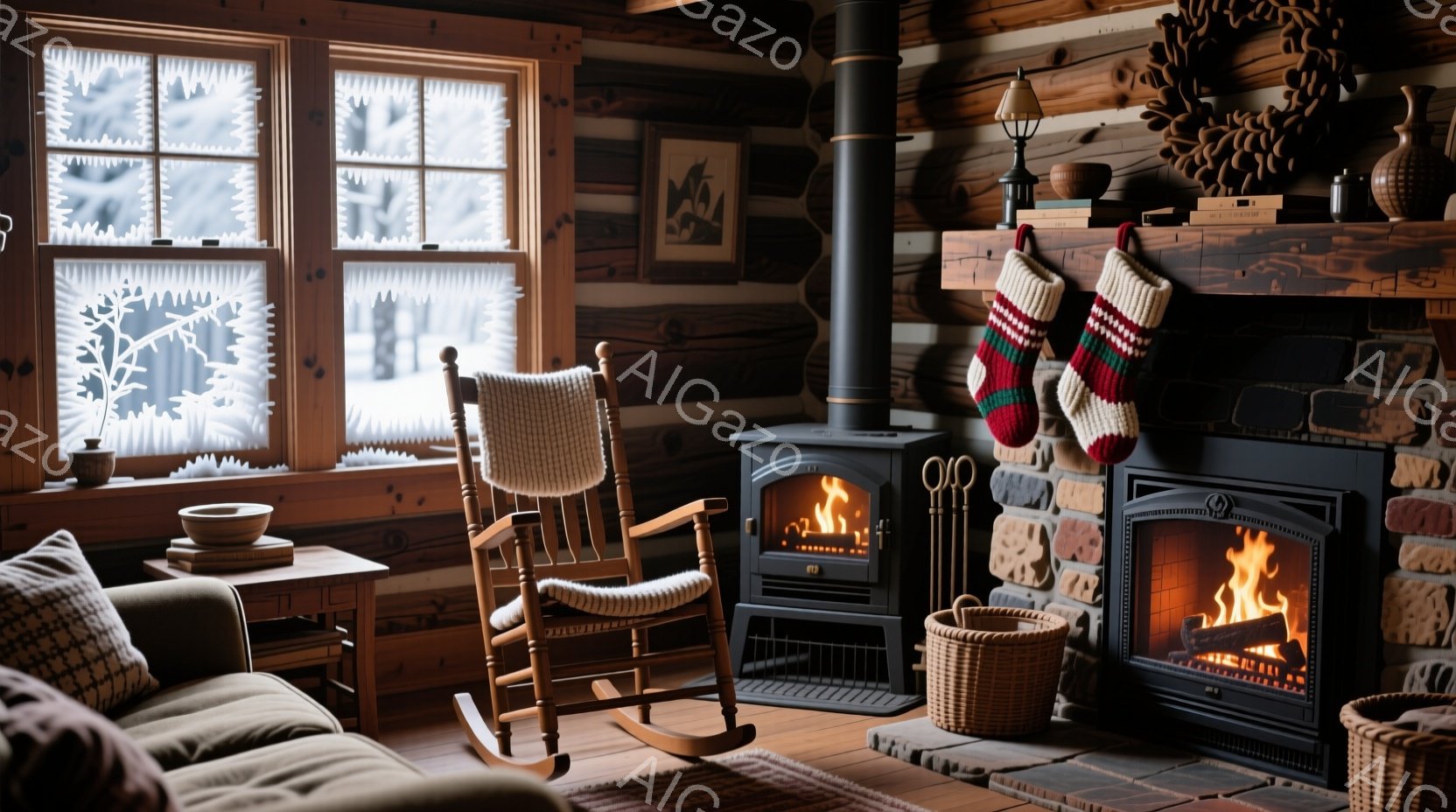 暖炉のある居心地の良いキャビン内部です。窓の外は雪景色で、室内に温かい光が差し込んでいます。ロッキングチェアとソファが置かれ、クリスマスソックスが暖炉の上に飾られ、居心地の良い冬の雰囲気を醸し出しています。