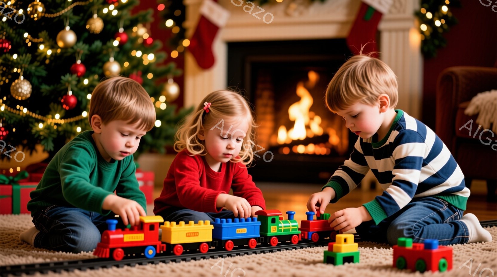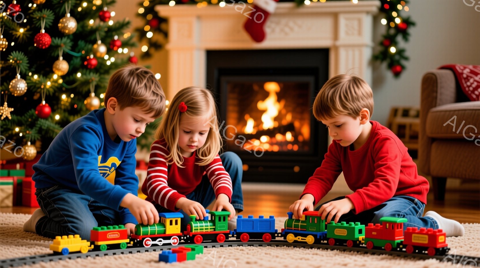 暖炉の前で、四人の子供たちがレゴの電車で遊んでいます。子供たちはそれぞれ赤いシャツ、緑のシャツ、青いシャツ、そして青いセーターを着ており、茶色の髪で、集中して電車を組み立てています。背景にはクリスマスツリーが飾られ、暖かい家庭的な雰囲気を感じられます。