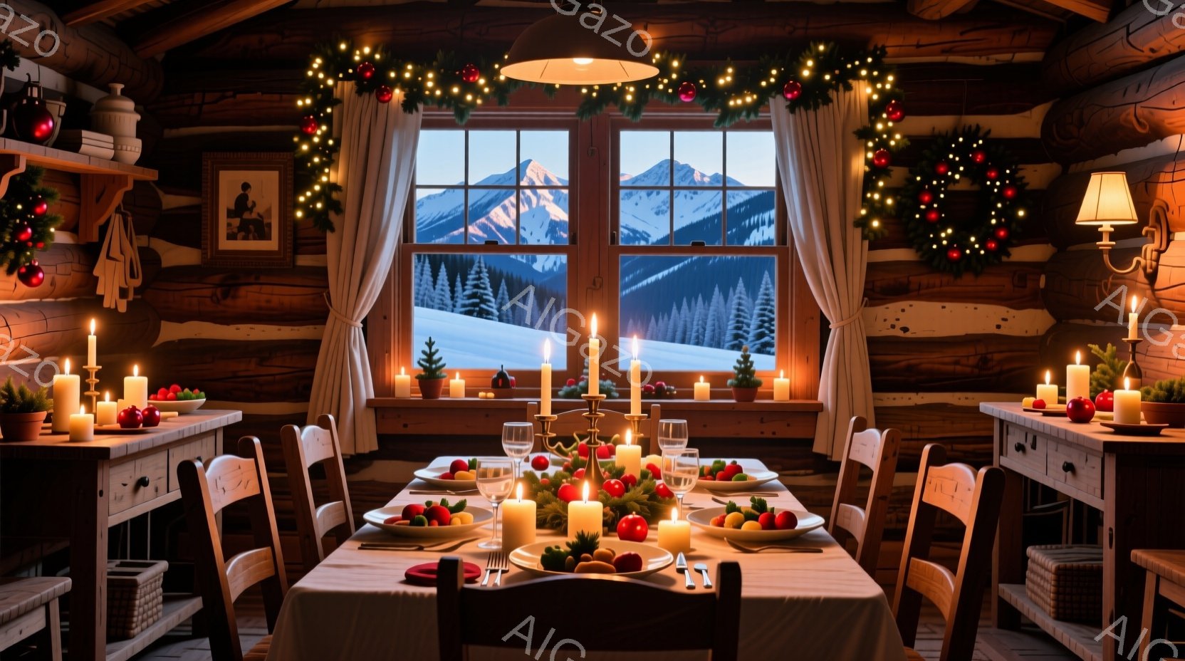 暖炉のある木の家で、クリスマスのディナーの準備が整っています。窓からは雪をかぶった山々が見え、室内にはたくさんのキャンドルが灯され、温かく華やかな雰囲気が漂っています。テーブルにはお皿やグラスが並べられ、クリスマスツリーが飾られ、静かで心安らぐクリスマスを予感させます。