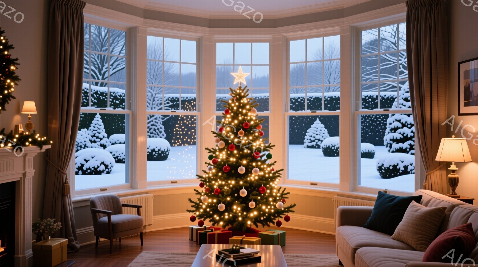 窓の外は雪景色で、庭の木々や建物が白い雪に覆われています。室内にはクリスマスツリーが飾られ、暖かく穏やかな雰囲気が漂っています。暖炉のそばには椅子とソファがあり、リラックスできる空間が演出されています。