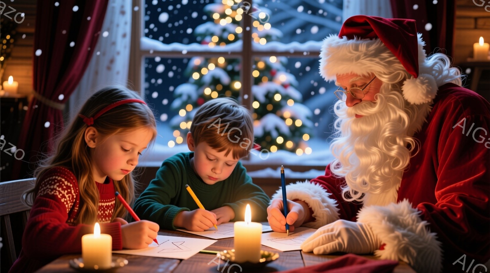 窓の外は雪景色で、庭の木々や茂みが真っ白に覆われています。室内には、クリスマスツリーが飾られ、明るい光で照らされ、下にはプレゼントが置かれています。暖炉の火が灯り、居心地の良い暖かい雰囲気が漂い、クリスマスの祝祭の準備が整っている様子が伺えます。