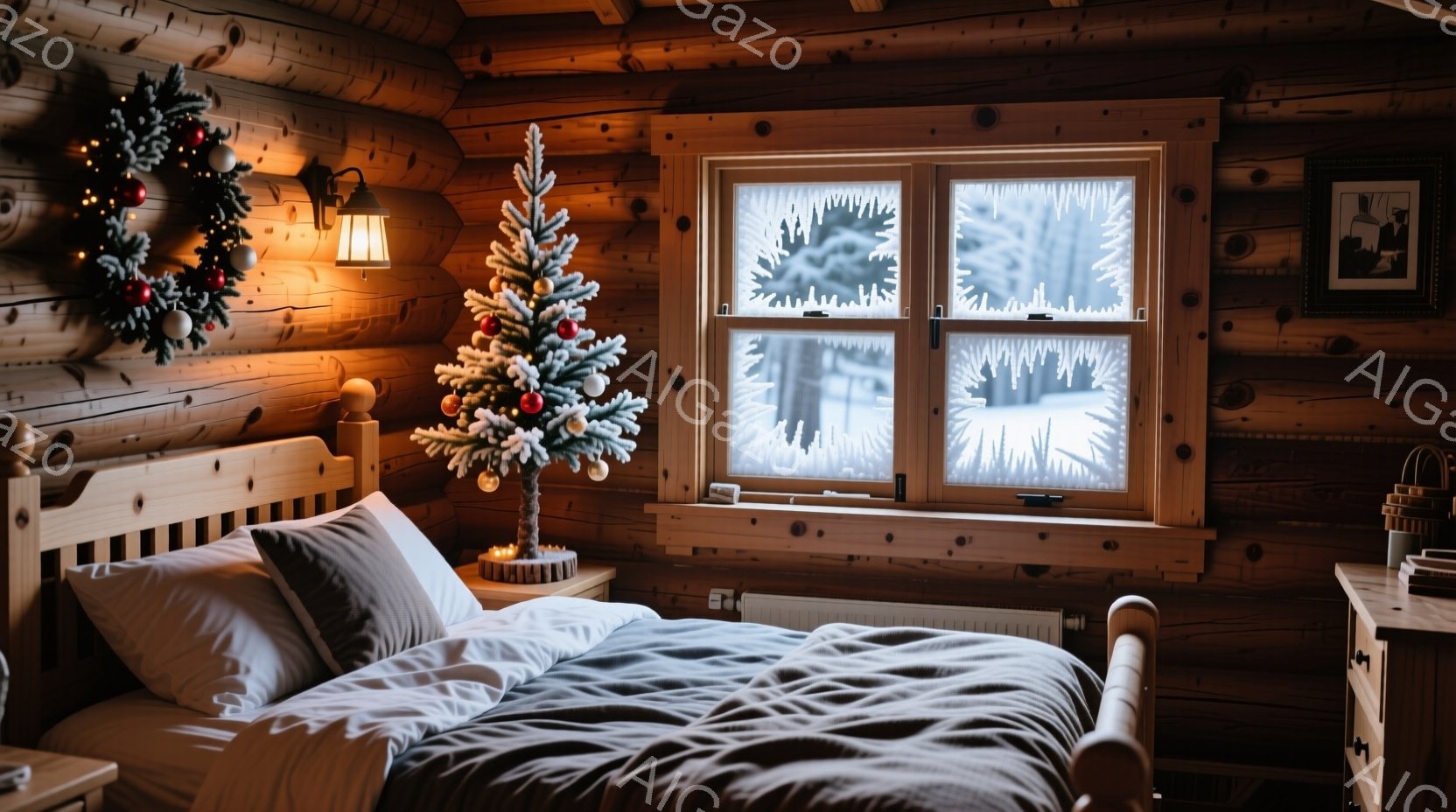 ログハウスの寝室には、白いベッドに温かみのある毛布がかけられ、クリスマスの飾り付けが施された小さなクリスマスツリーが置かれています。窓の外には雪景色が広がり、暖炉のような柔らかな光が室内に広がり、クリスマスの温かく居心地の良い雰囲気を醸し出しています。壁にはクリスマスリースが飾られ、部屋全体にホリデーシーズンらしさが漂っています。