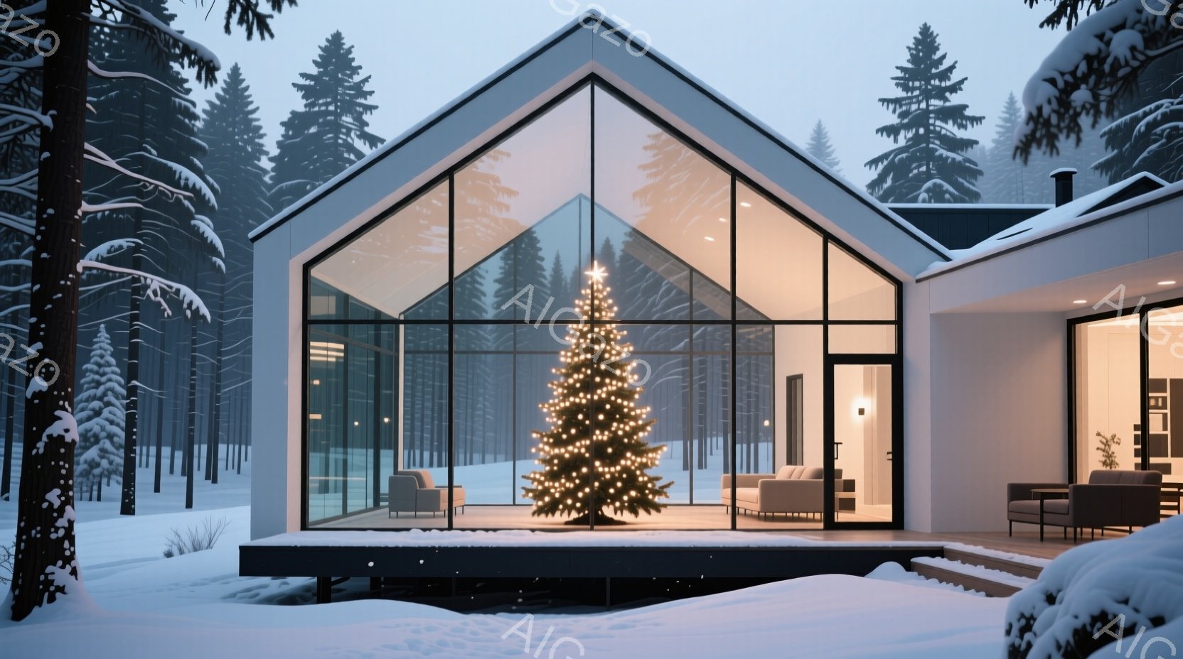 広大な雪景色の中に、大きなガラス張りの家が佇んでいます。リビングにはクリスマスツリーが飾られ、温かい光が灯り、2つのアームチェアが置かれています。背景には雪をまとった針葉樹林が広がり、静かで穏やかな冬の雰囲気を醸し出しています。