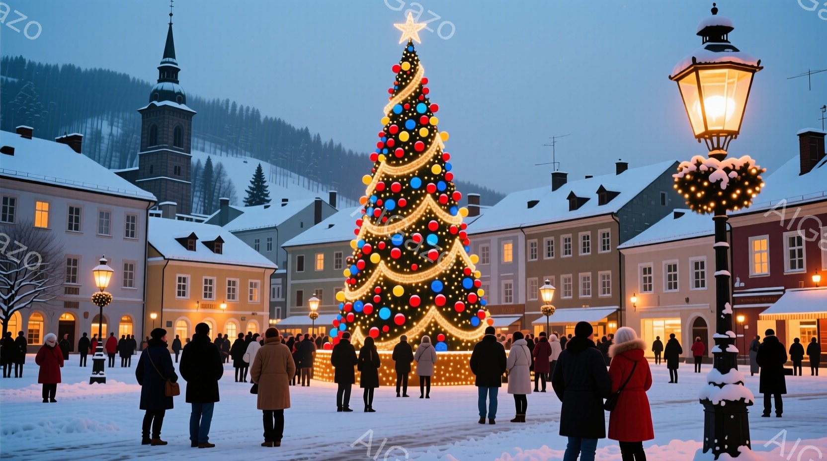 広場の中央には巨大なクリスマスツリーが飾られ、暖色のライトで照らされています。多くの人々が冬のコートやジャケットを身に着け、ツリーを眺めたり、談笑したりしています。背景には雪に覆われた建物が並び、遠くには雪山が望め、全体的に温かく、お祝いムードに包まれています。