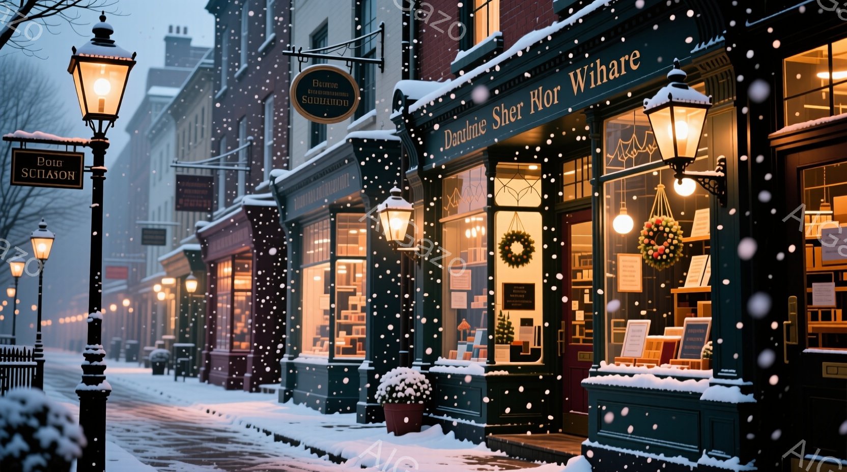 雪が降り積もる街並みが描かれています。暖色の街灯が雪に照らされ、店舗のショーウィンドウには冬の装飾が施されています。遠くには数人の歩行者がコートを着て歩いており、静かで落ち着いた冬の雰囲気が漂っています。