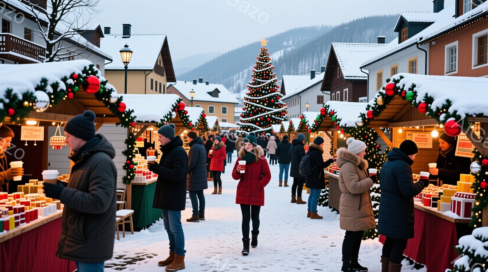賑やかなクリスマスマーケットの様子で、雪景色の中に人々が暖かい服装で楽しんでいます。多くの人が紙コップに入った飲み物を手に持ち、赤いジャケットや青いコートを着た人々が目立ちます。背景には、雪を頂いた山々と可愛らしい建物が並び、クリスマスの飾り付けが施された屋台がマーケットの活気を添えています。
