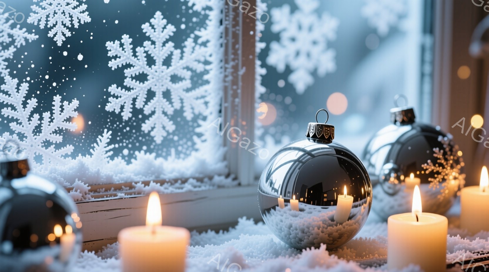 窓辺には雪の結晶模様が描かれ、銀色のオーナメントボールと点灯されたキャンドルが並べられています。キャンドルの温かい光がオーナメントボールに反射し、穏やかで幻想的な雰囲気を醸し出しています。全体的に静かで冬らしい、落ち着いた雰囲気が漂っています。