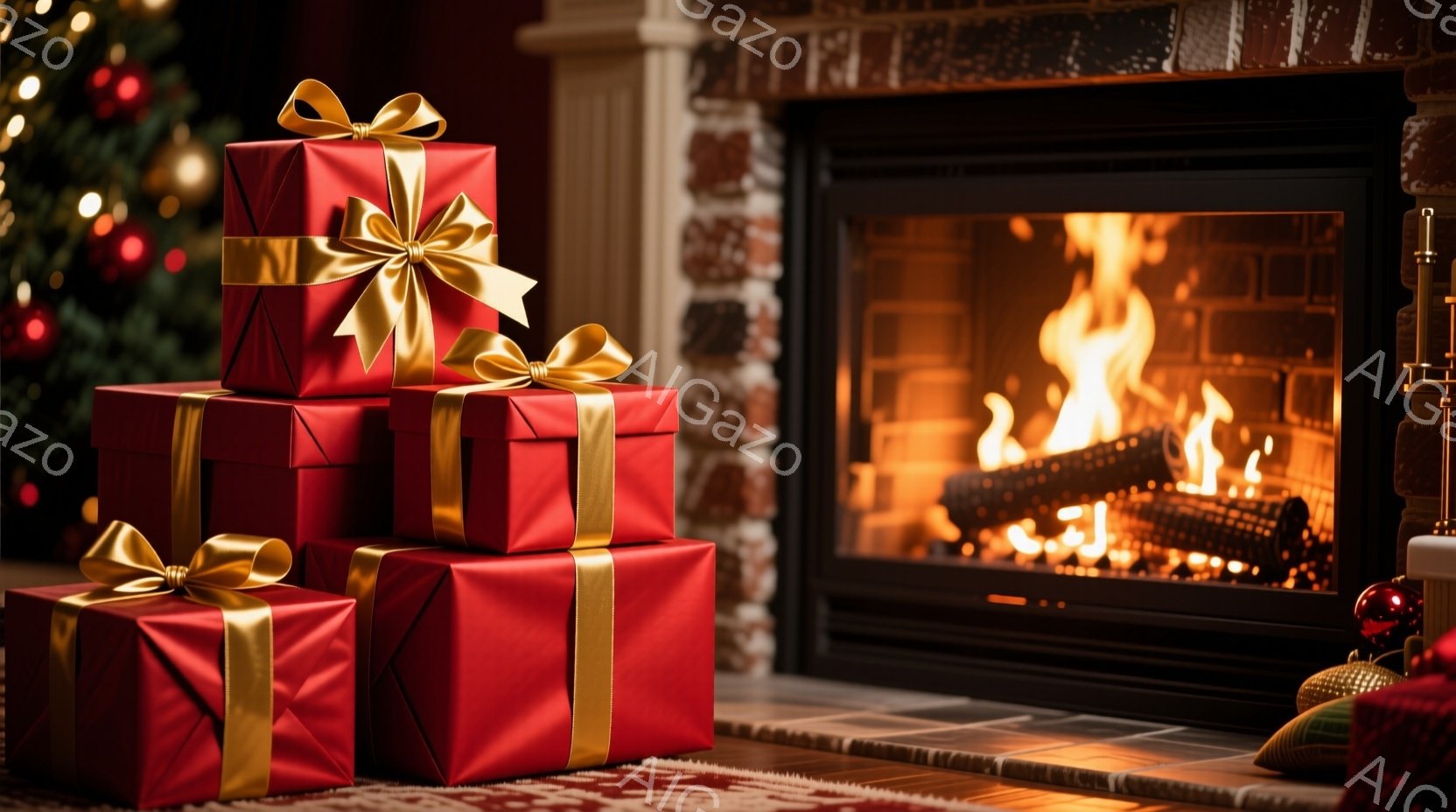 真っ赤な包装紙で丁寧に包まれたプレゼントが、積み重ねられて絨毯の上に置かれている。背景には暖炉があり、燃え盛る炎が部屋全体を温かい光で満たしている。クリスマスの飾り付けがぼんやりと見え、全体的に暖かく、お祝いムードに満ちた雰囲気である。