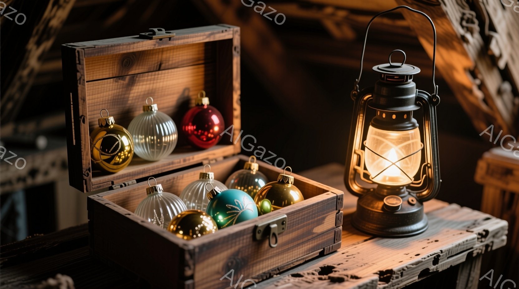 古びた木製の箱の中に、様々な色のクリスマスオーナメントが並べられています。箱の隣には、点灯したケロシンランタンが置かれており、暖かな光を放っています。背景は木の板張りの壁で、少し暗い室内、あるいは納屋のような雰囲気で、冬の静寂と温かさを感じさせます。
