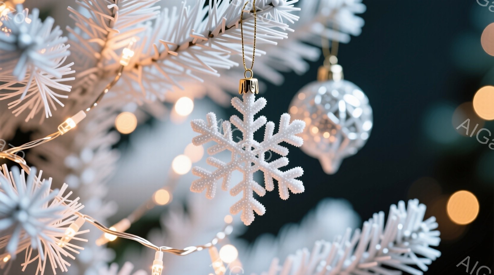 白いクリスマスツリーの枝が画面を占め、きらめく電飾と装飾品が冬の暖かさを演出しています。雪の結晶と光沢のあるオーナメントが、背景の暗い色合いと対照的に輝き、お祝いの雰囲気を漂わせています。全体的に、洗練された冬のワンダーランドのような、静かで夢幻的な雰囲気が印象的です。