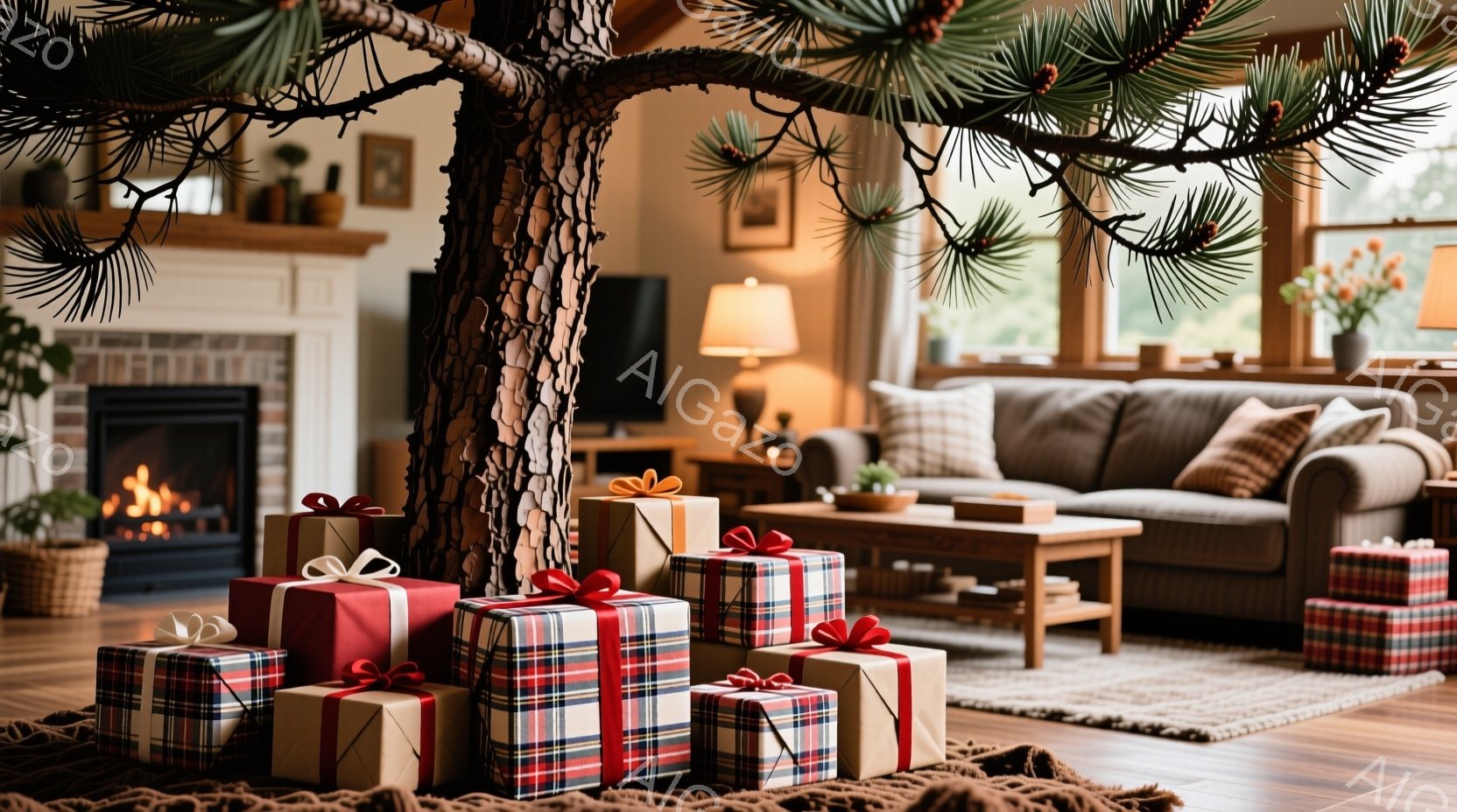 温かみのあるリビングルームには、様々な大きさの包装されたプレゼントが、木の根元に積み重ねられています。背景には暖炉、ソファ、植物が見え、部屋全体が落ち着いた雰囲気で飾られています。自然光が差し込み、全体的にホリデーシーズンの心地よい雰囲気を感じさせます。