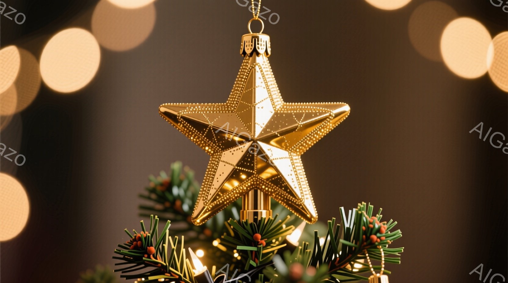 輝く金色の星が、クリスマスツリーの頂上に飾られている。ツリーの緑の葉と赤い実、そして暖かい光のぼかしが、華やかで穏やかな雰囲気を醸し出している。背景は暗く、星とツリーの光が際立って見える。