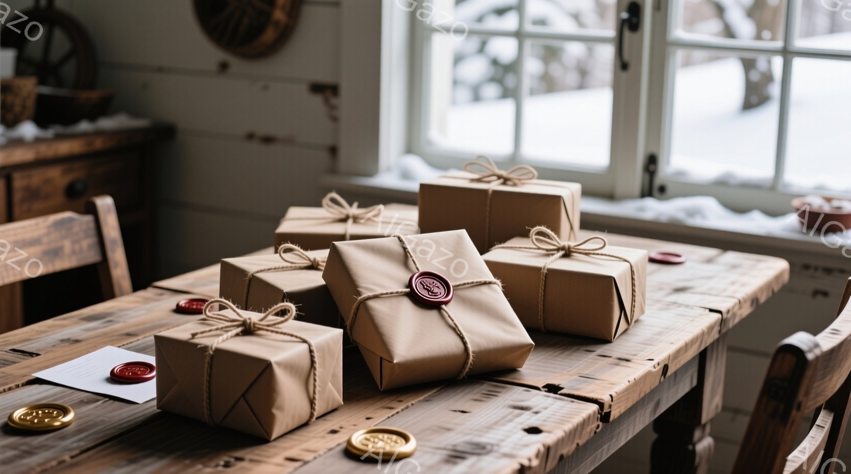 古びた木製のテーブルの上に、麻紐で結ばれた包装紙で包まれたプレゼントがいくつか置かれています。窓の外には雪景色が広がり、テーブルの隅には蝋印が転がされています。全体的に暖かく、静かで、冬の穏やかな雰囲気が漂っています。