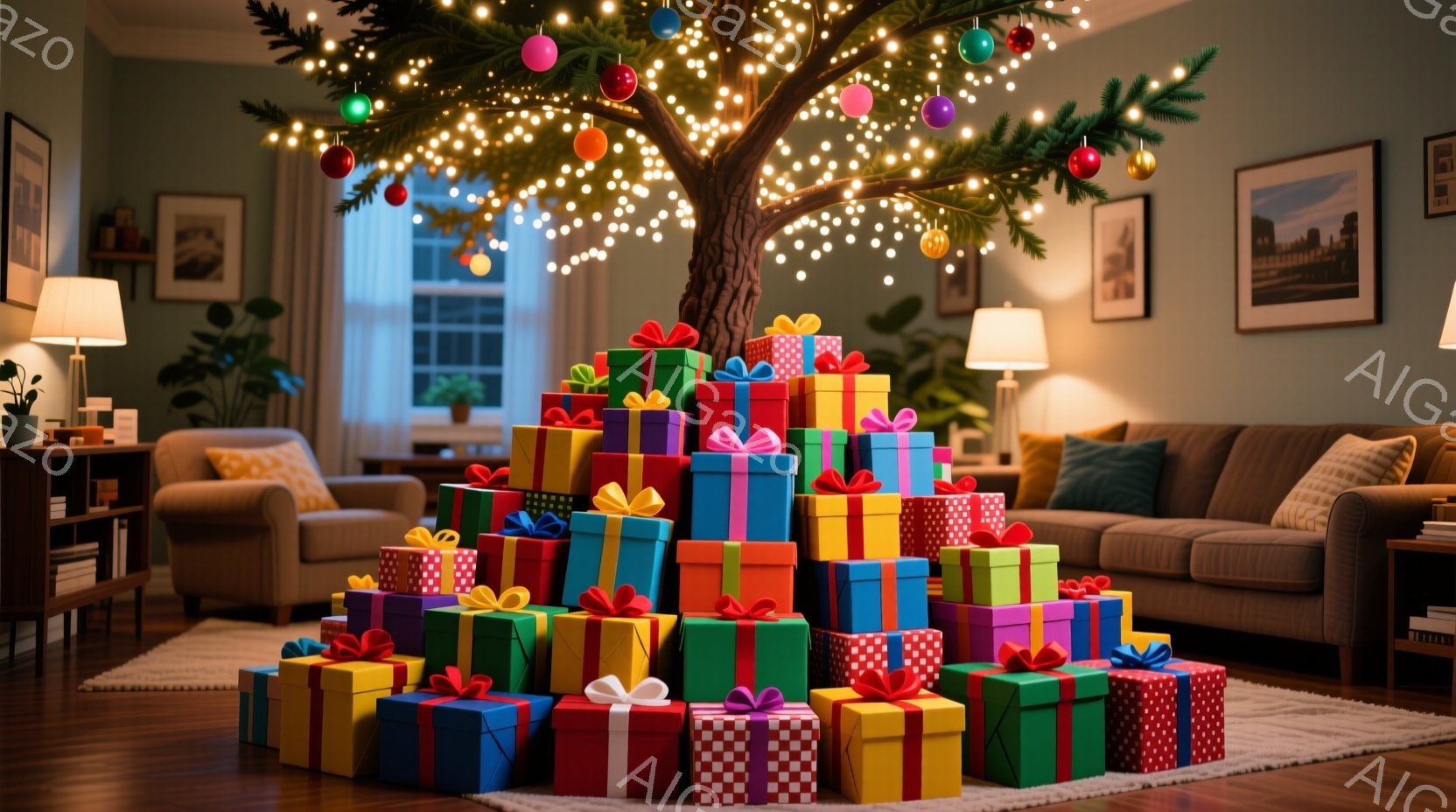 暖炉と窓から差し込む光で照らされたリビングルームには、カラフルなラッピングペーパーで包まれたプレゼントの山が積み上げられています。プレゼントはクリスマスツリーの代わりに、部屋の中心にピラミッド型に配置され、暖かく、お祝いの雰囲気を作り出しています。背景には、灰色のソファ、絵画、そして窓の外には夜の風景が見え、穏やかで心地よい空間が広がっています。