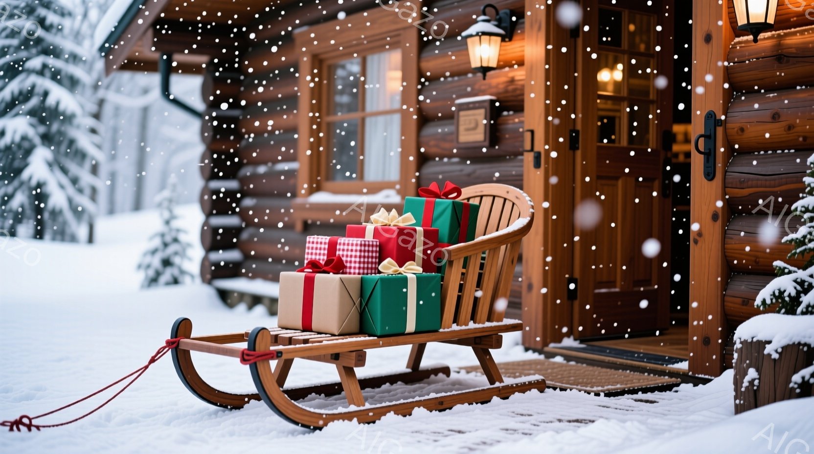 雪が降り積もる、ログハウスの前にそりが置かれています。そりには、赤、緑、ベージュのリボンで飾られた、様々な大きさのプレゼントが積み重ねられています。背景にはクリスマスリースが飾られたドアと、雪に覆われた自然が見え、温かく穏やかなクリスマスの雰囲気が漂っています。