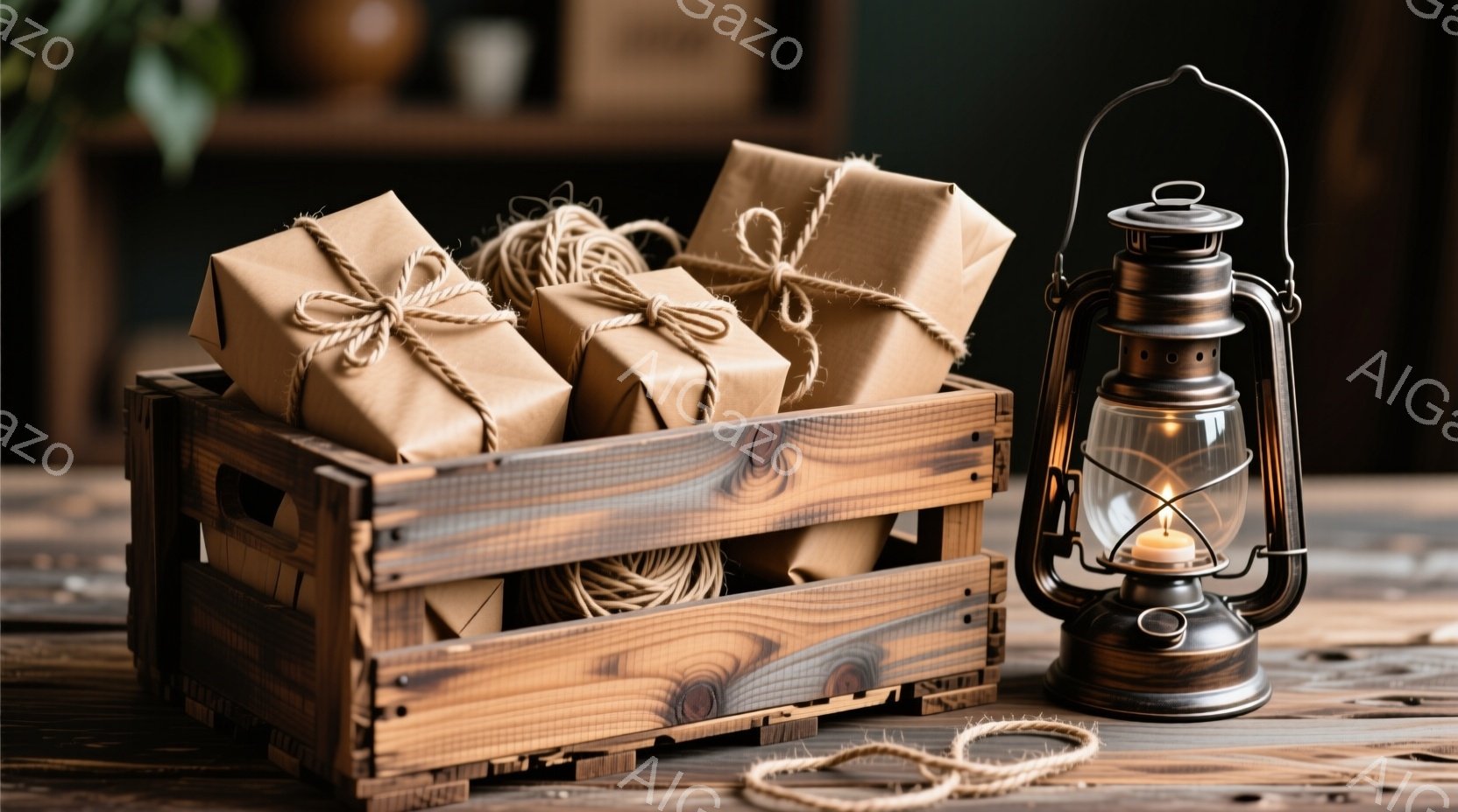 古びた木製の箱の中に、麻紐で結ばれた包装紙で包まれたプレゼントがいくつか入っています。箱の隣には、オイルランプが置かれており、柔らかい光を放っています。背景にはぼやけた家具が見え、全体的に暖かく、素朴で、落ち着いた雰囲気を醸し出しています。