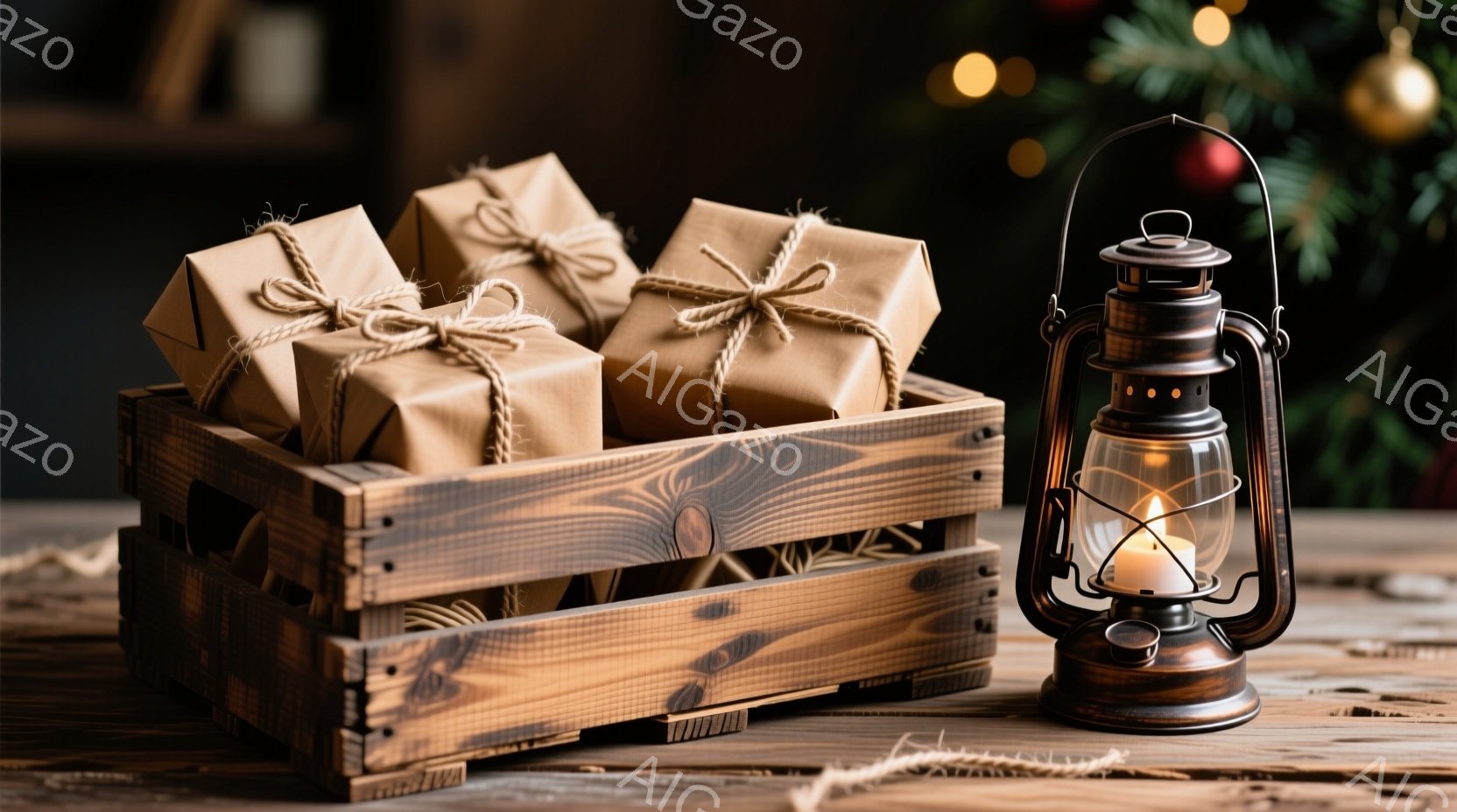 古びた木箱の中に、麻ひもで結ばれた茶色の包装紙で包まれたプレゼントがいくつか入っています。箱の隣には、灯りが灯ったレトロなオイルランプが置かれ、粗い麻ひもが箱からこぼれ出しています。全体的に、暖かく、素朴で、落ち着いた雰囲気を醸し出しています。