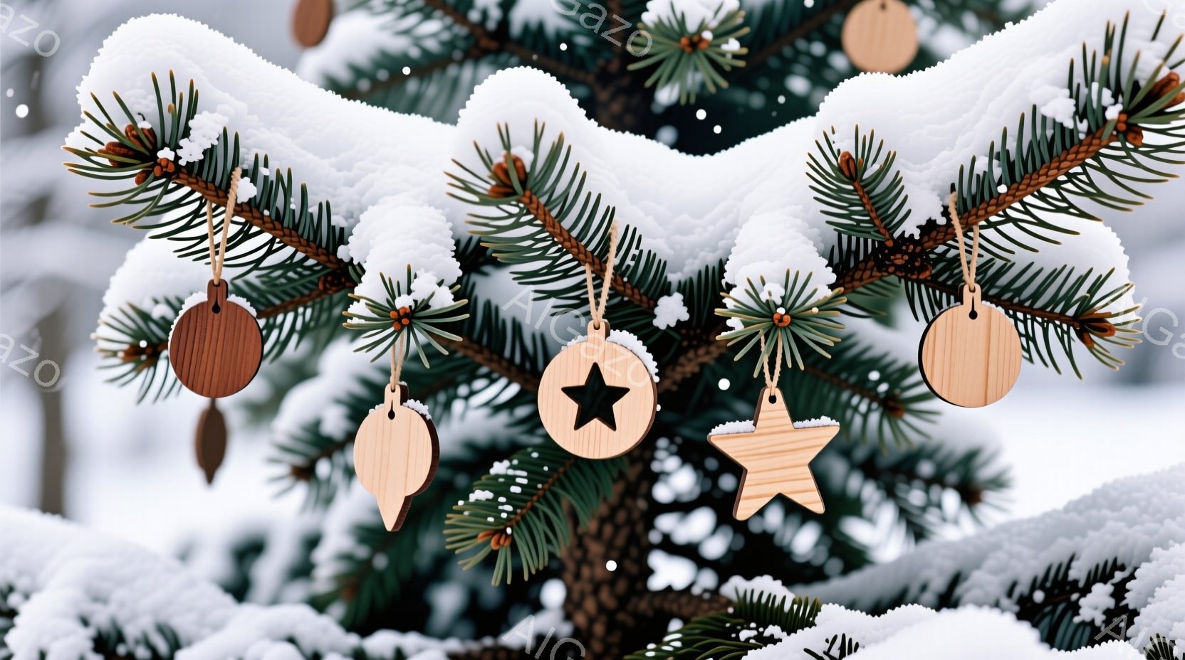 雪に覆われた針葉樹の枝に、様々な模様の木のオーナメントが吊り下げられています。背景は白く、ぼやけた雪景色が広がっており、冬の静寂と温かさを感じさせます。オーナメントの木の色と雪のコントラストが美しく、クリスマスの飾り付けの様子を想起させます。