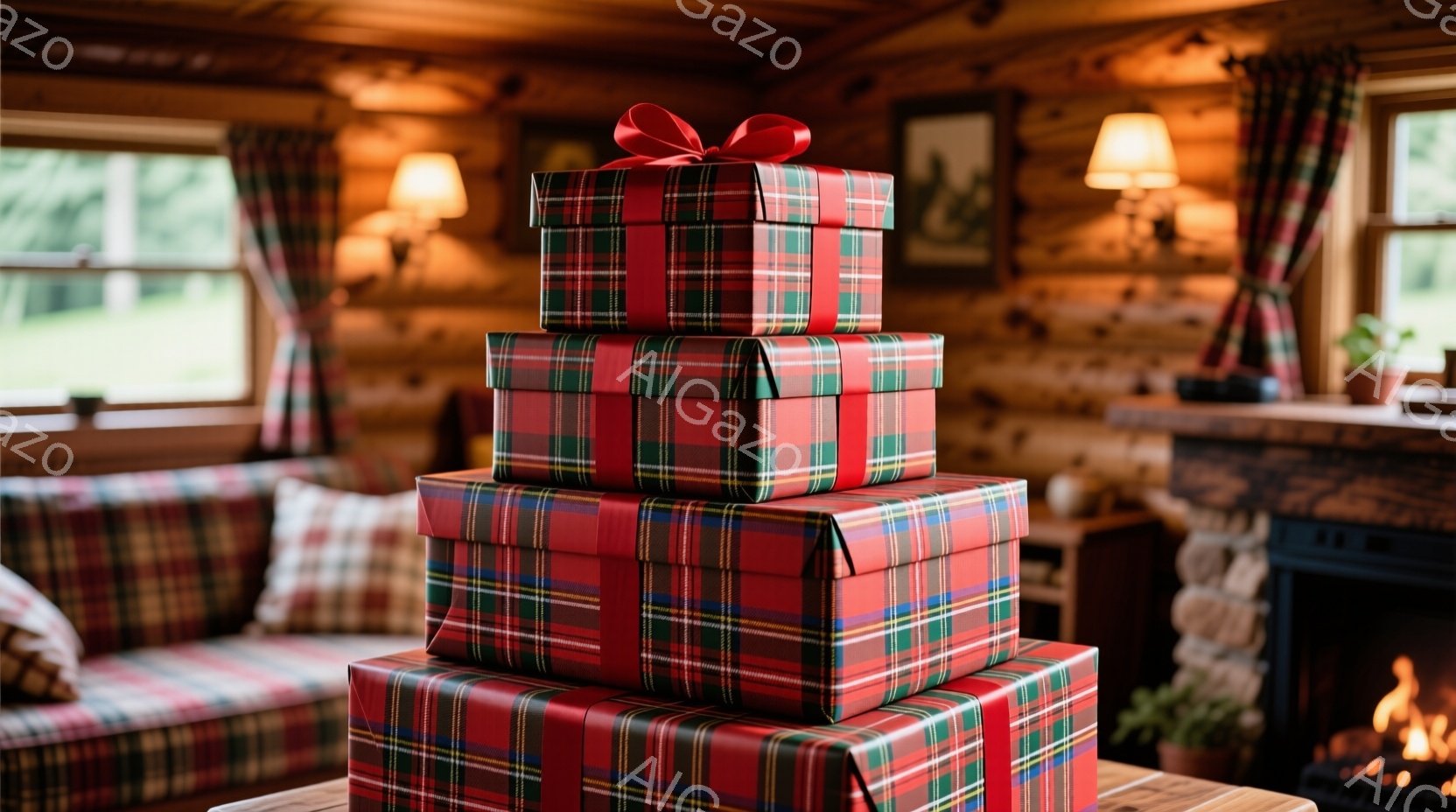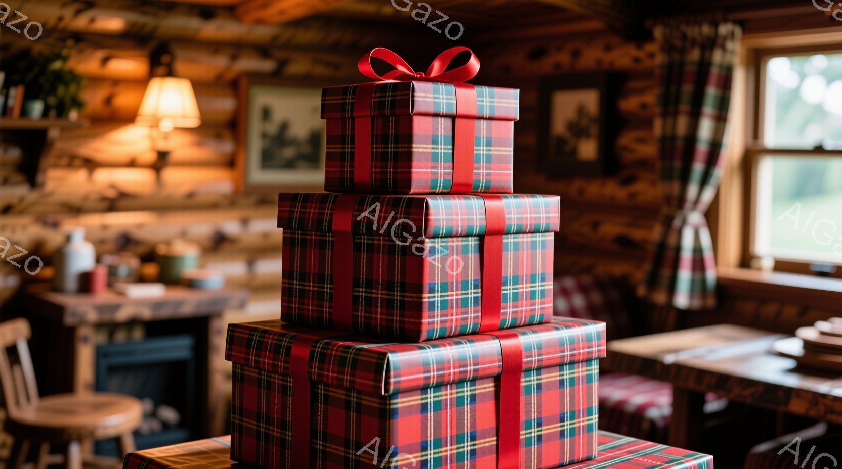 暖炉のある居間のテーブルに、赤いタータンチェック柄のギフトボックスがピラミッド状に積み重ねられています。背景には、木製の壁、キャビネット、そして窓から差し込む自然光が見え、温かく落ち着いた雰囲気を醸し出しています。 部屋全体が木造で、素朴でありながら洗練された空間を作り出しています。