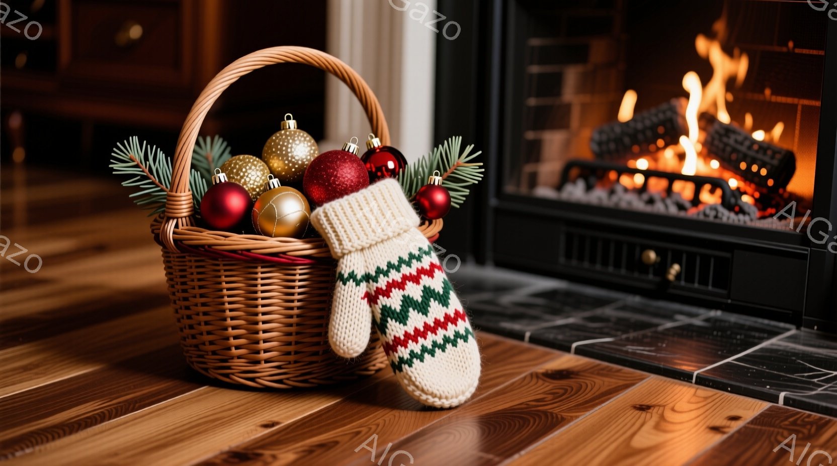 暖炉の前に置かれたバスケットには、クリスマスオーナメントと編み込みのミトンが飾られています。背景には暖炉の炎が燃え盛り、木製の床が暖かく照らされています。全体的に、温かく居心地の良いクリスマスの雰囲気が漂っています。