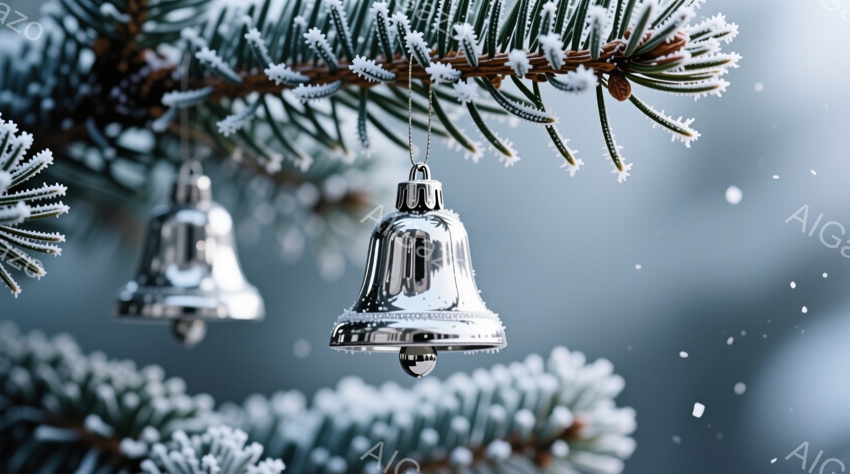 鮮やかな白い雪が舞う中、クリスマスツリーの枝に銀色のベルとオーナメントが吊り下げられています。雪が枝に付着し、冬の静かで穏やかな雰囲気を醸し出しています。背景はぼやけており、冬の幻想的な世界を連想させます。
