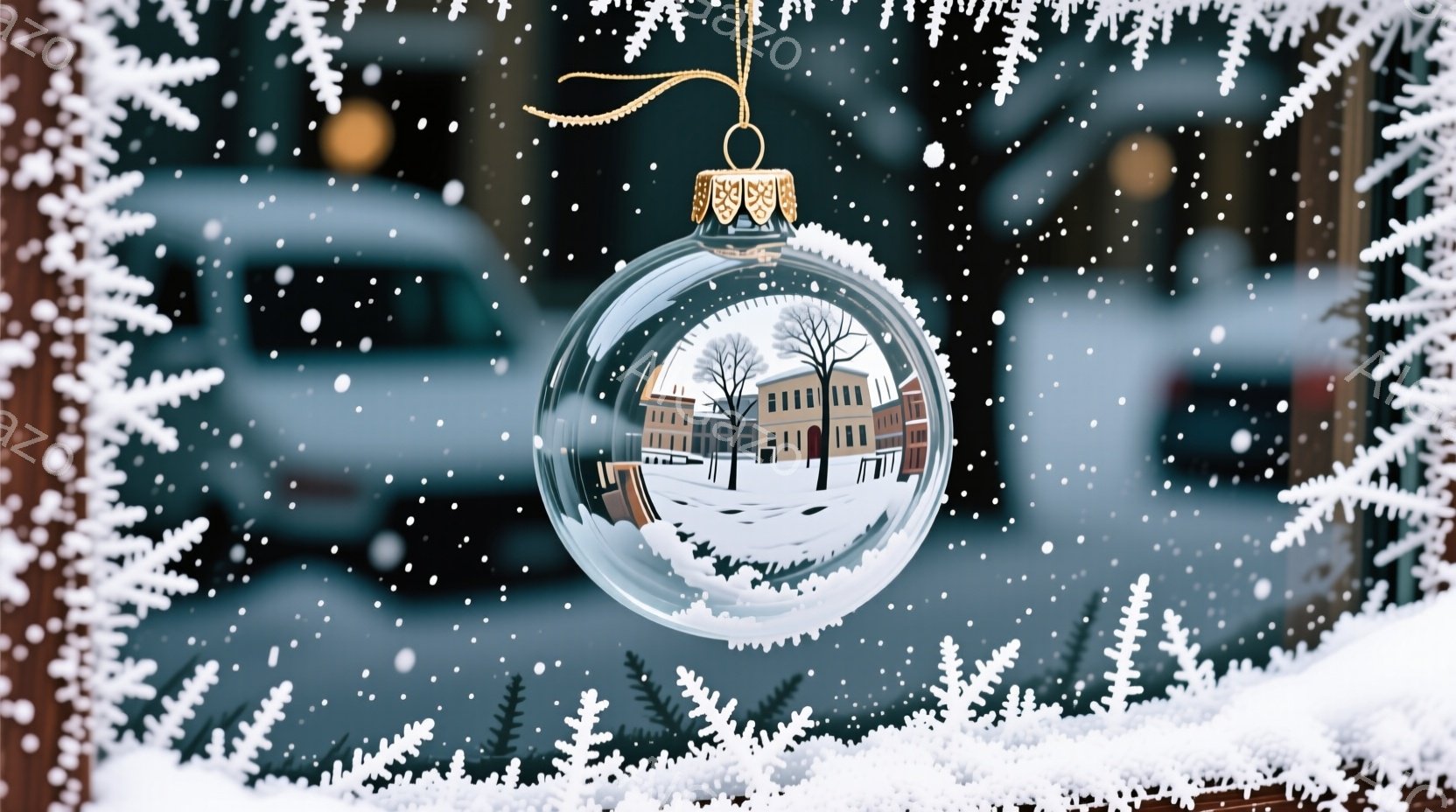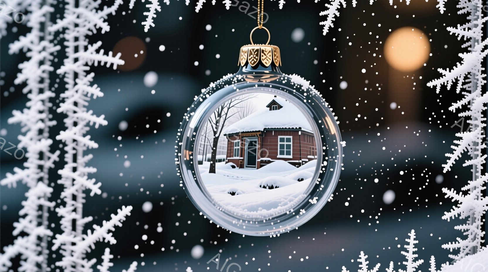 雪が舞う冬の風景を閉じ込めた3つのガラス製クリスマスオーナメントが、白い装飾の枠の中で輝いている。各オーナメントの中には、雪に覆われた松の木と、遠くに見える建物が配置されており、冬の静寂と美しさを表現している。全体的に幻想的で、温かく穏やかなクリスマスの雰囲気が漂う。