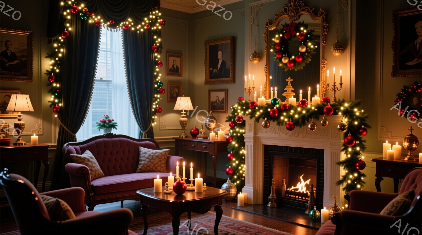 温かい光が差し込むダイニングルームには、木製のテーブルと椅子が配置され、クリスマスの装飾が施されています。壁には棚が設置され、様々な食器や装飾品が並び、窓にはクリスマスリースが飾られています。全体的に、暖かく居心地の良い、クリスマスの雰囲気が漂う空間です。