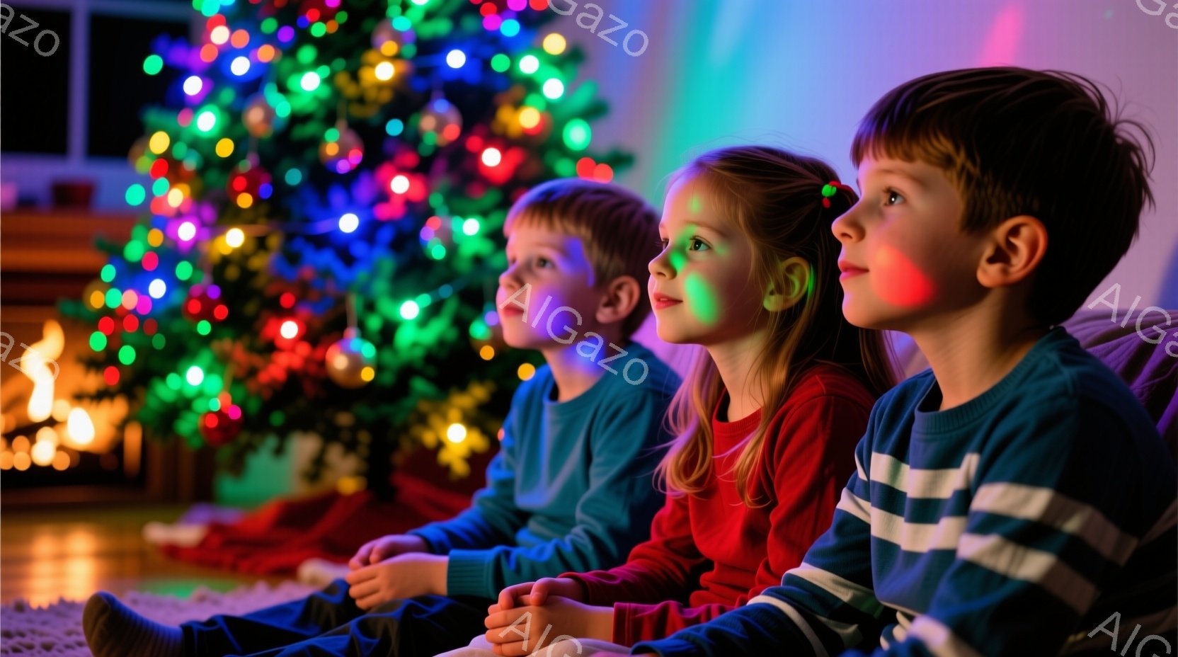 クリスマスツリーの前で3人の子供が床に座って何かを見上げています。女の子はグレーのセーターを着て髪を後ろで束ね、男の子は赤いシャツを着ています。背景には、色とりどりの電飾で飾られたクリスマスツリーがあり、暖かく幻想的な雰囲気を作り出しています。