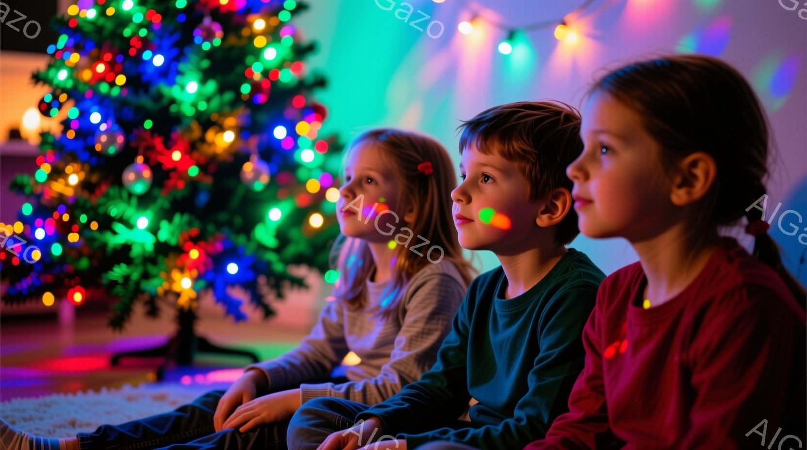 3人の子供たちが、色とりどりのクリスマスツリーを背景に床に座って何かを見上げています。彼らはそれぞれ、カジュアルな服装で、笑顔や期待に満ちた表情を浮かべています。背景は暗く、ツリーの光が暖かく、お祝いの雰囲気を醸し出しています。