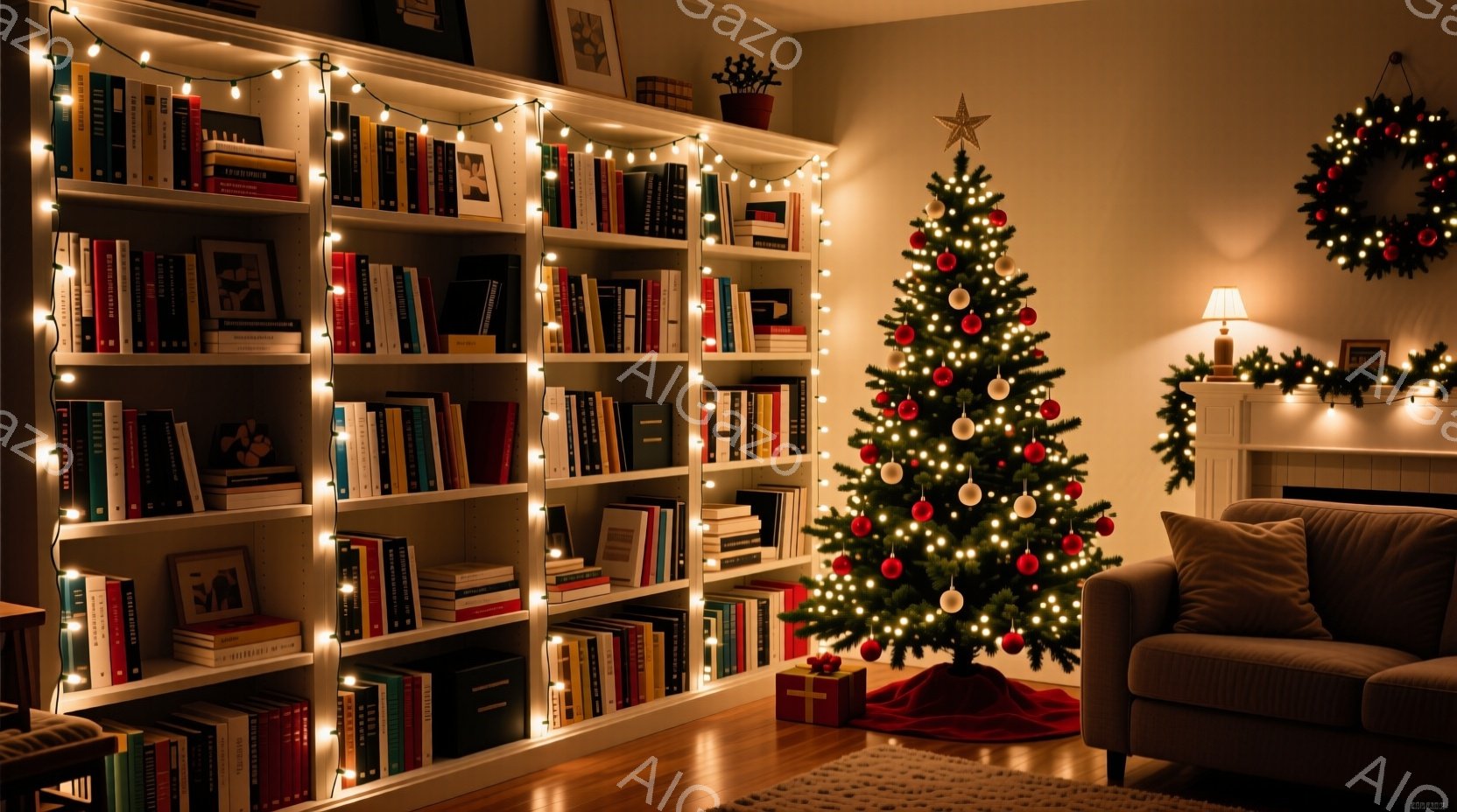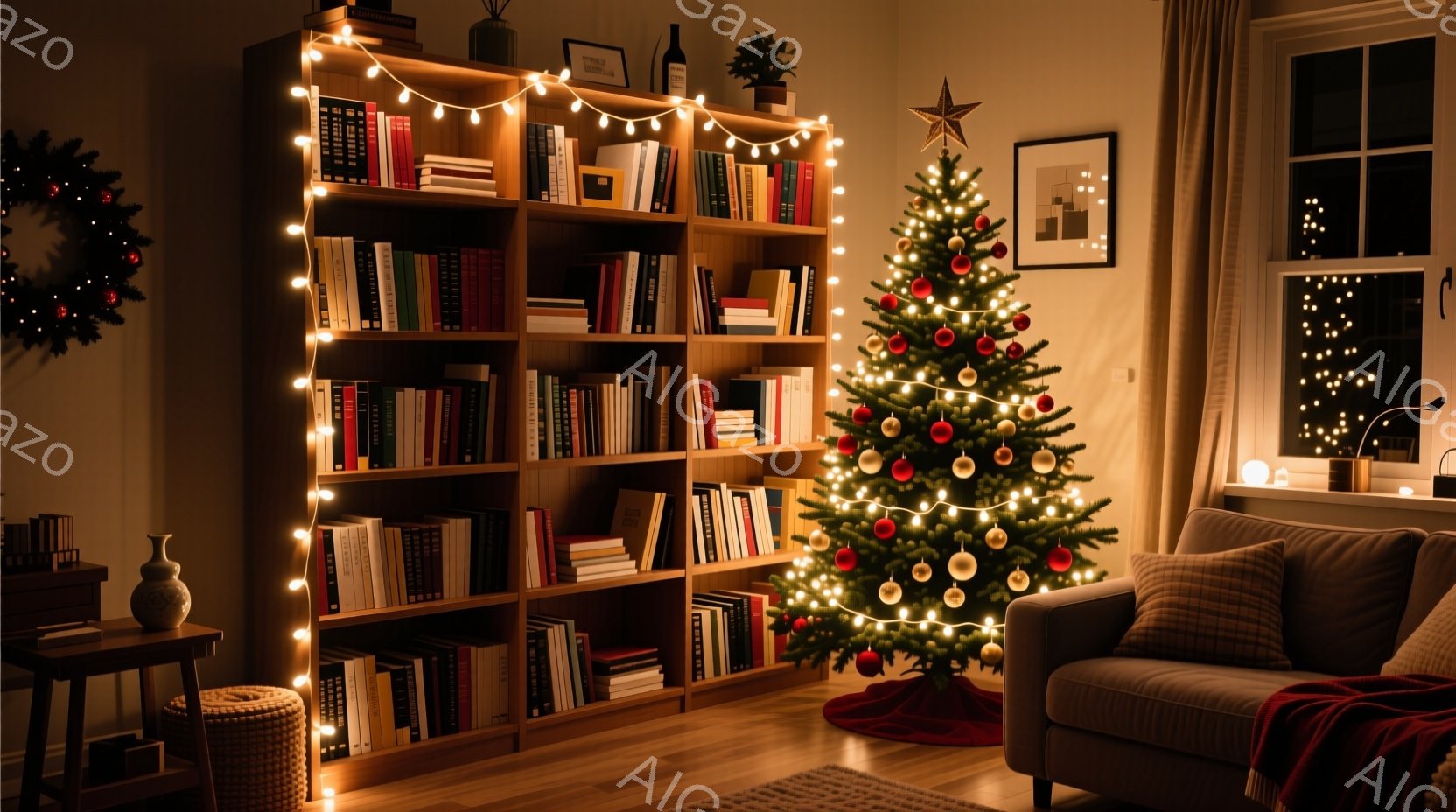 暖炉のそばに飾られたクリスマスツリーが、温かい光を放っている部屋です。本棚には様々な色の本が並び、部屋全体が落ち着いた雰囲気に包まれています。窓の外には夜景が広がり、クリスマスの飾り付けが窓から見える建物に灯りを添えています。