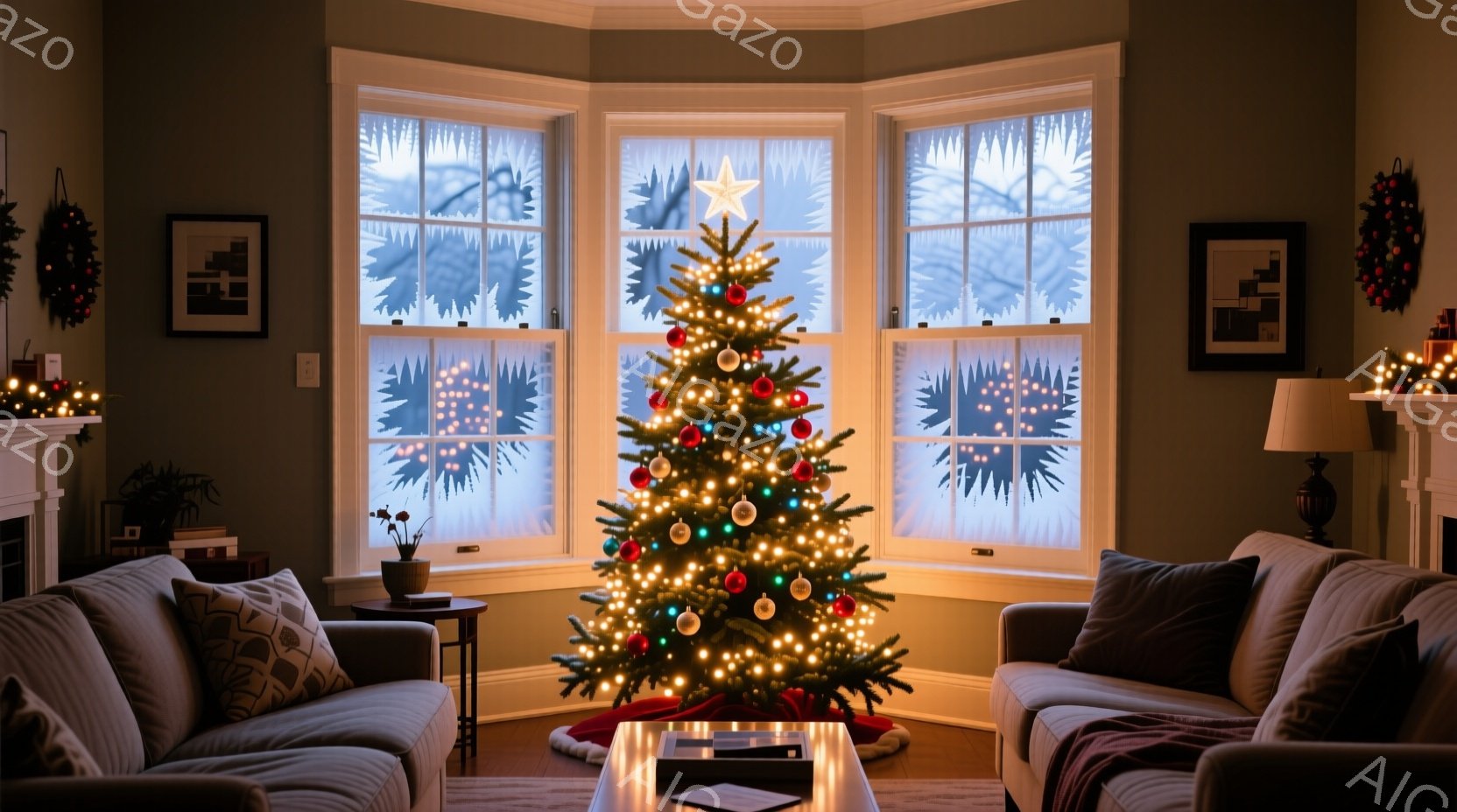 部屋にはクリスマスツリーが飾られており、窓の外は雪景色です。暖炉のそばには小さなクリスマスツリーが置かれ、部屋全体が温かい光で満たされています。ソファにはクッションが置かれ、クリスマスの静かで穏やかな雰囲気が漂っています。