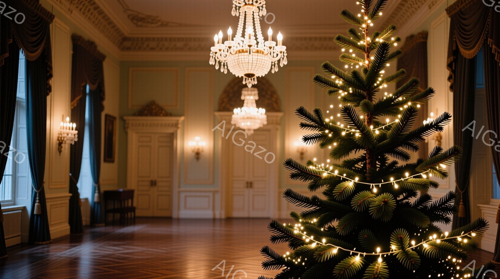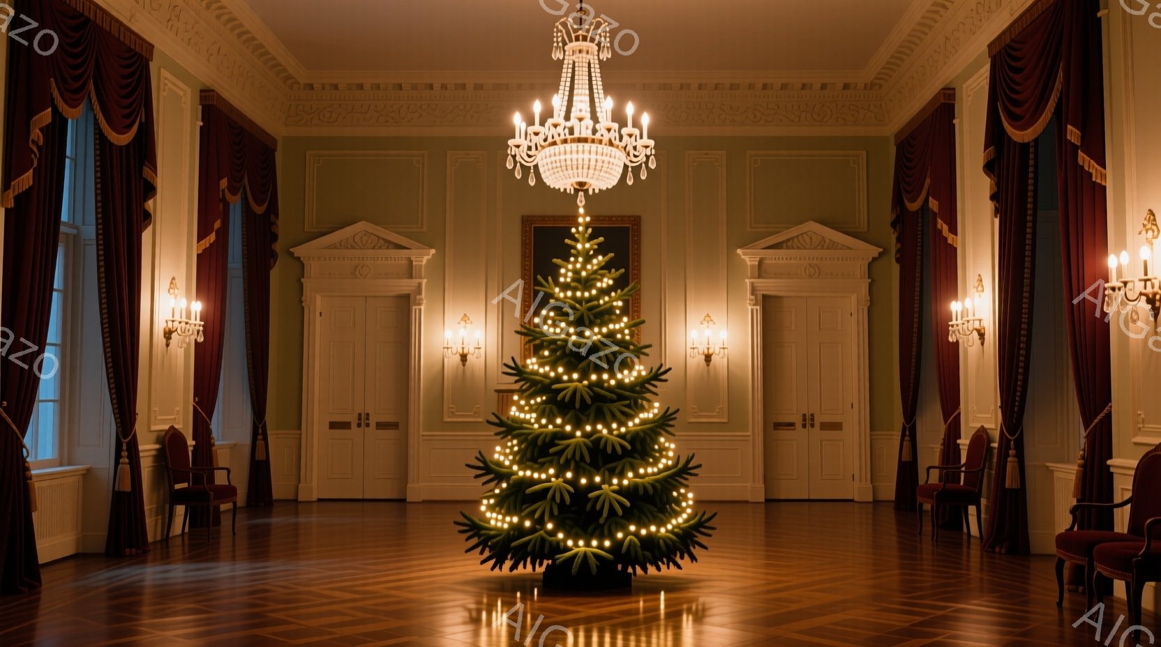 豪華な部屋の中心には、電飾で飾られた大きなクリスマスツリーが置かれている。部屋は落ち着いた緑色で彩られ、暖炉、肖像画、そして装飾的なシャンデリアがその雰囲気を高めている。床は磨かれた木製で、全体的にクラシックで上品な雰囲気が漂っている。