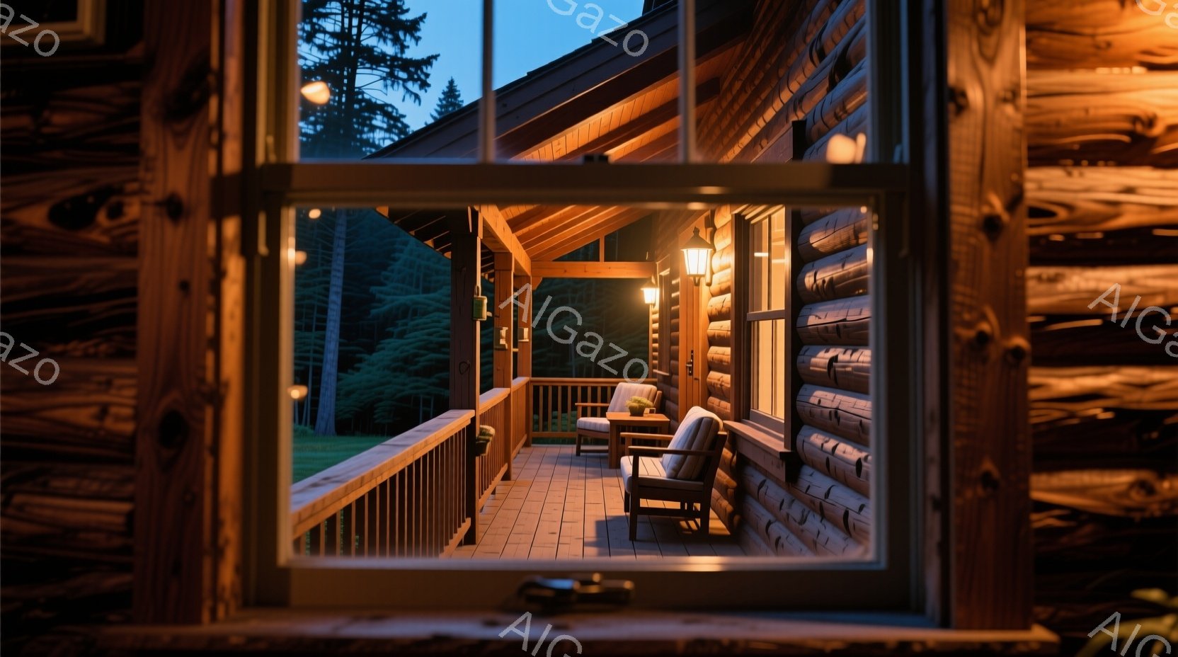 ログハウスの窓から見える夕暮れ時の景色で、木製のバルコニーに置かれたベンチが印象的です。遠くには緑豊かな森林が広がり、穏やかな光が木々の間から差し込み、静かで落ち着いた雰囲気を醸し出しています。室内は暖色系の照明で照らされ、木製の壁が温かみを増し、リラックスできる空間を表現しています。