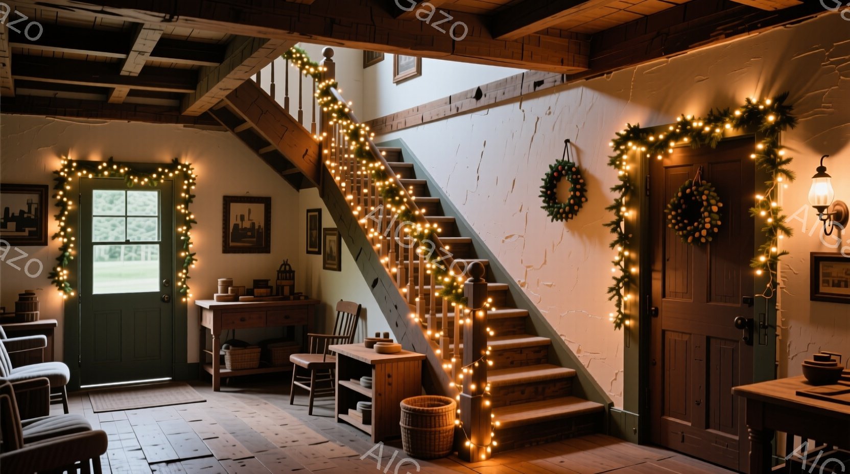 暖炉のある木の家の中は、クリスマス装飾で華やかに飾られています。階段の手すりと壁には、緑の葉と温かい光のイルミネーションが飾られ、ホリデーシーズンを祝福しています。暖かく居心地の良い雰囲気で、木製の家具と自然光が快適な空間を作り出しています。