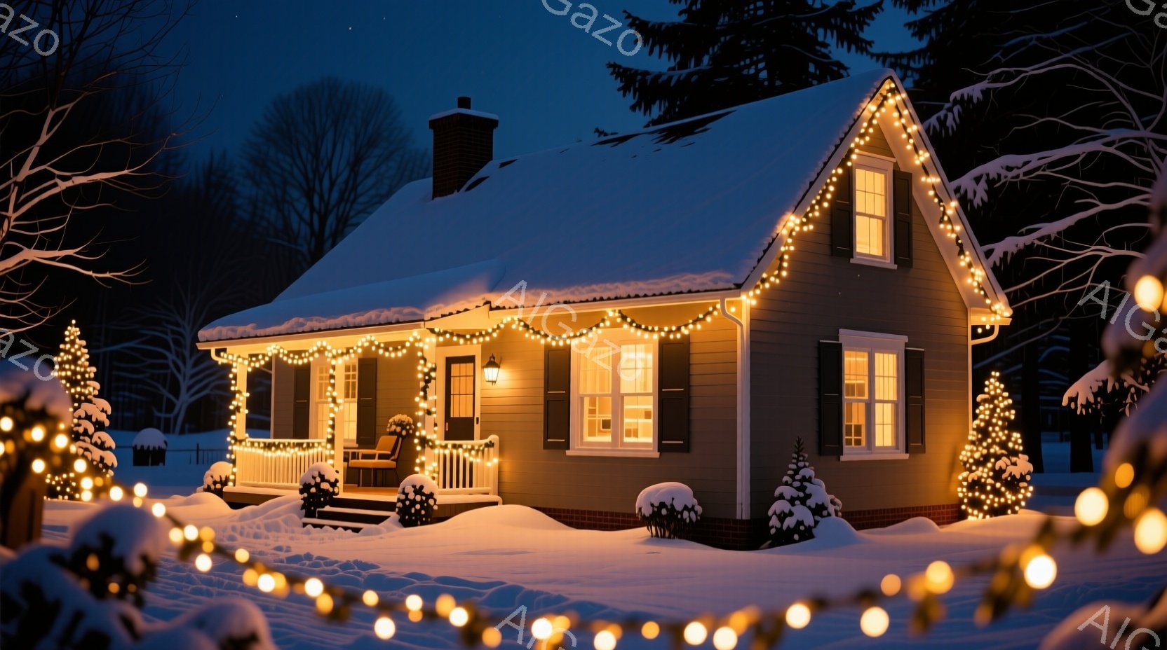 雪に覆われた家の正面が、温かい光で照らされています。家の周りにはクリスマスツリーが飾られ、屋根や窓枠にはイルミネーションが輝き、冬の夜の静かで温かい雰囲気を醸し出しています。背景には暗い木々と雪景色が広がり、暖かく穏やかなクリスマスの夜を彷彿とさせます。