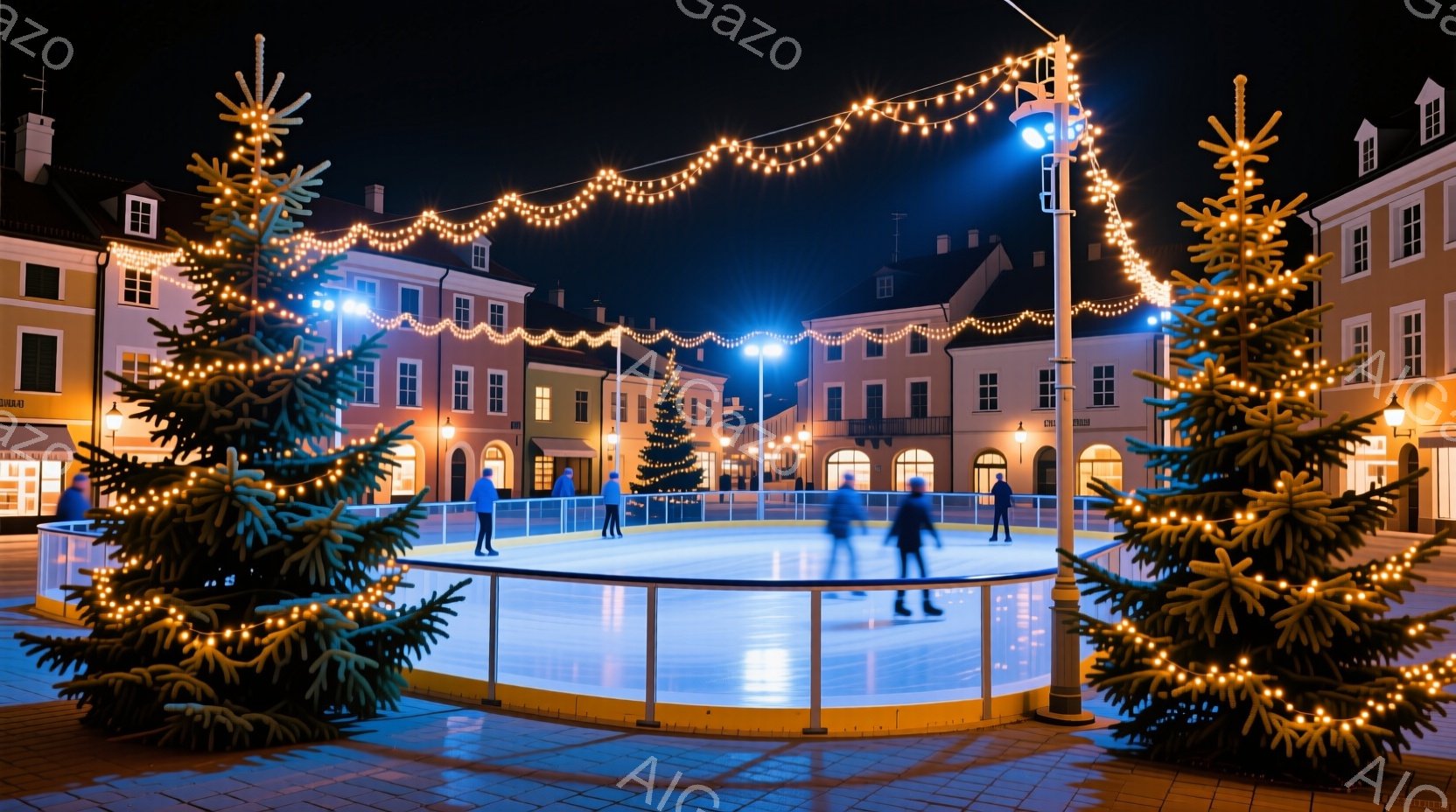 広場にはアイススケートリンクが設置され、数人がスケートを楽しんでいます。リンクの周囲にはクリスマスツリーが飾られ、暖かい光を放ち、背景には歴史的な建物が並び、クリスマスの夜の穏やかな雰囲気を醸し出しています。リンクの光とツリーの装飾が、冬の夜を華やかに彩っています。